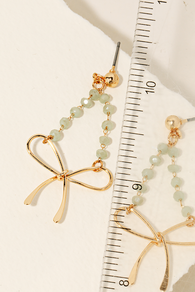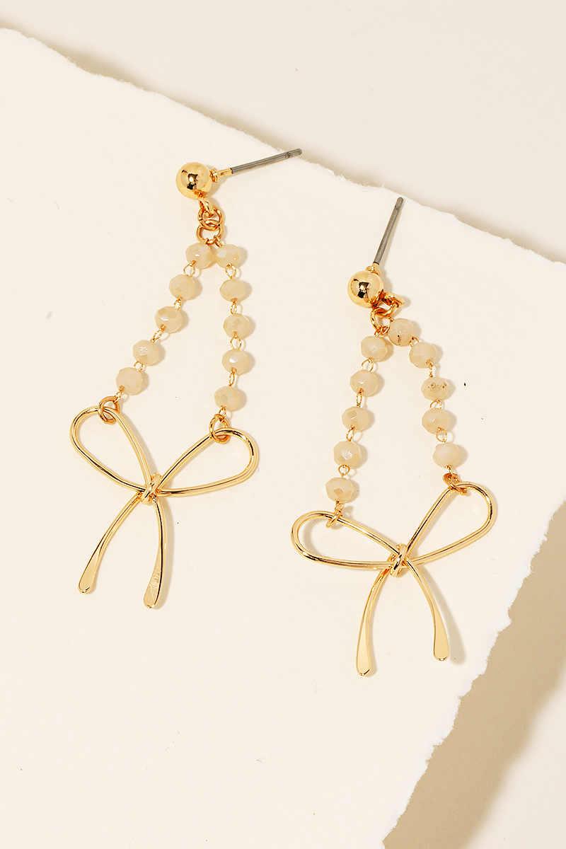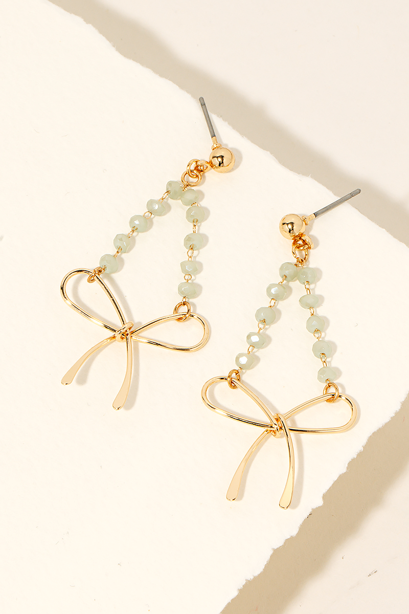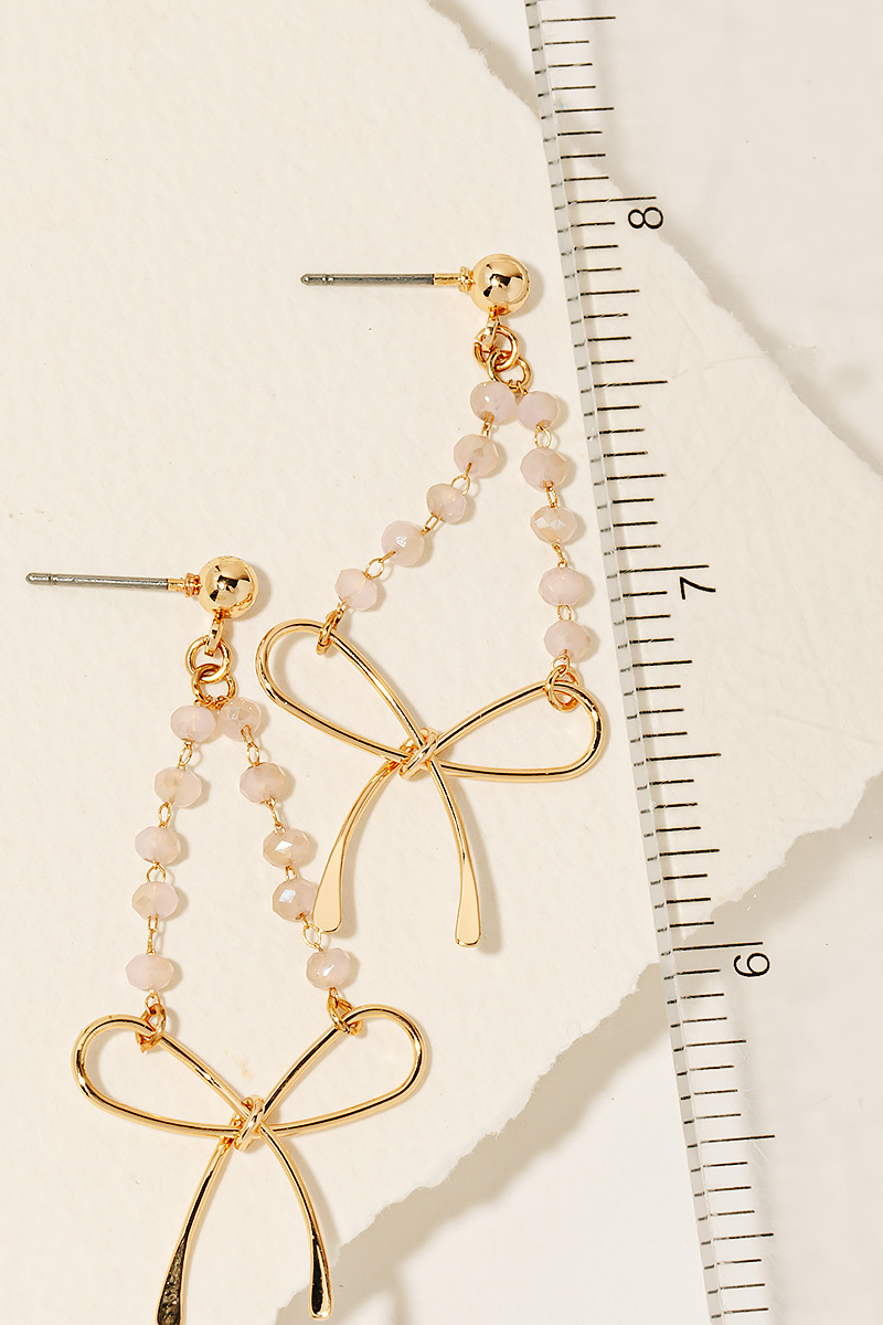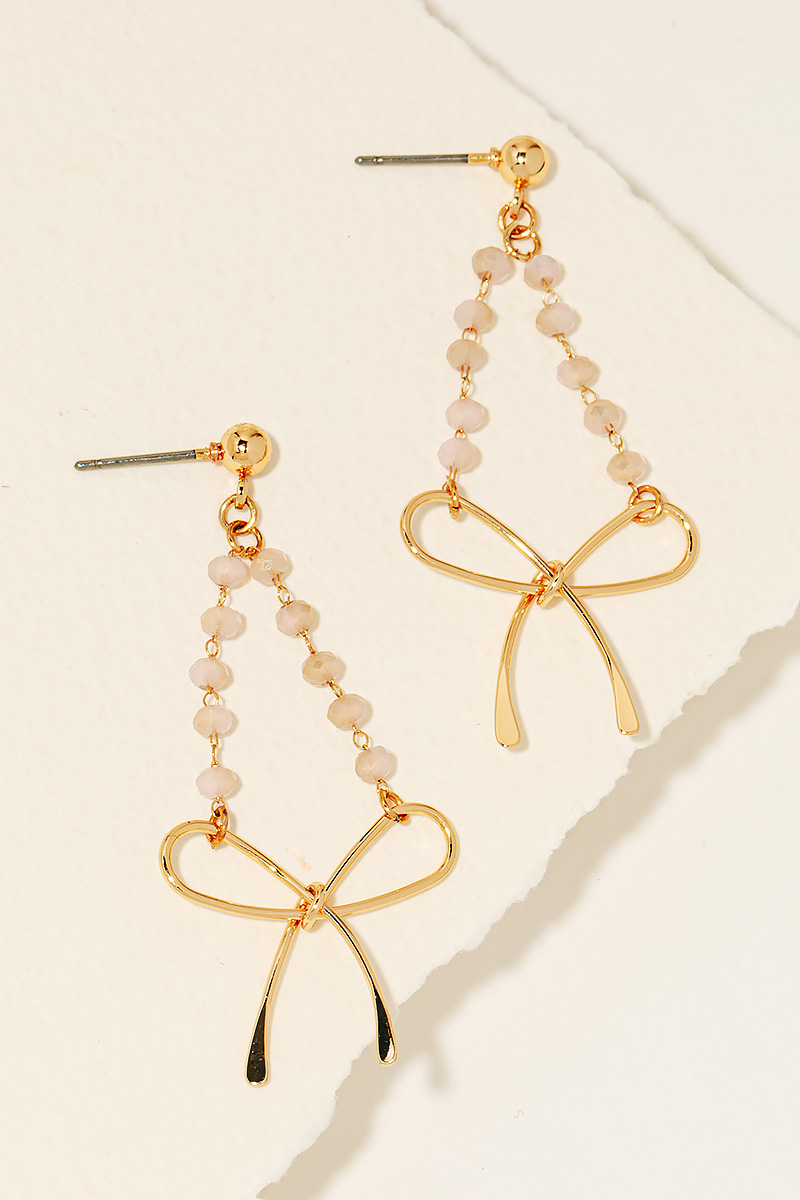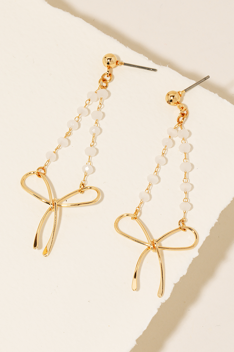 • A stunning piece that is sure to turn heads, this pair of dangle earrings features a distinct beaded chain ribbon bow charm design. Infuse a hint of luxury into your daily attire with this versatile accessory, a must-have for those who appreciate timeless elegance. Available in GDBK, GDGB, GDMNT, GDPK and GDWH. This item is sold in packs of 1.