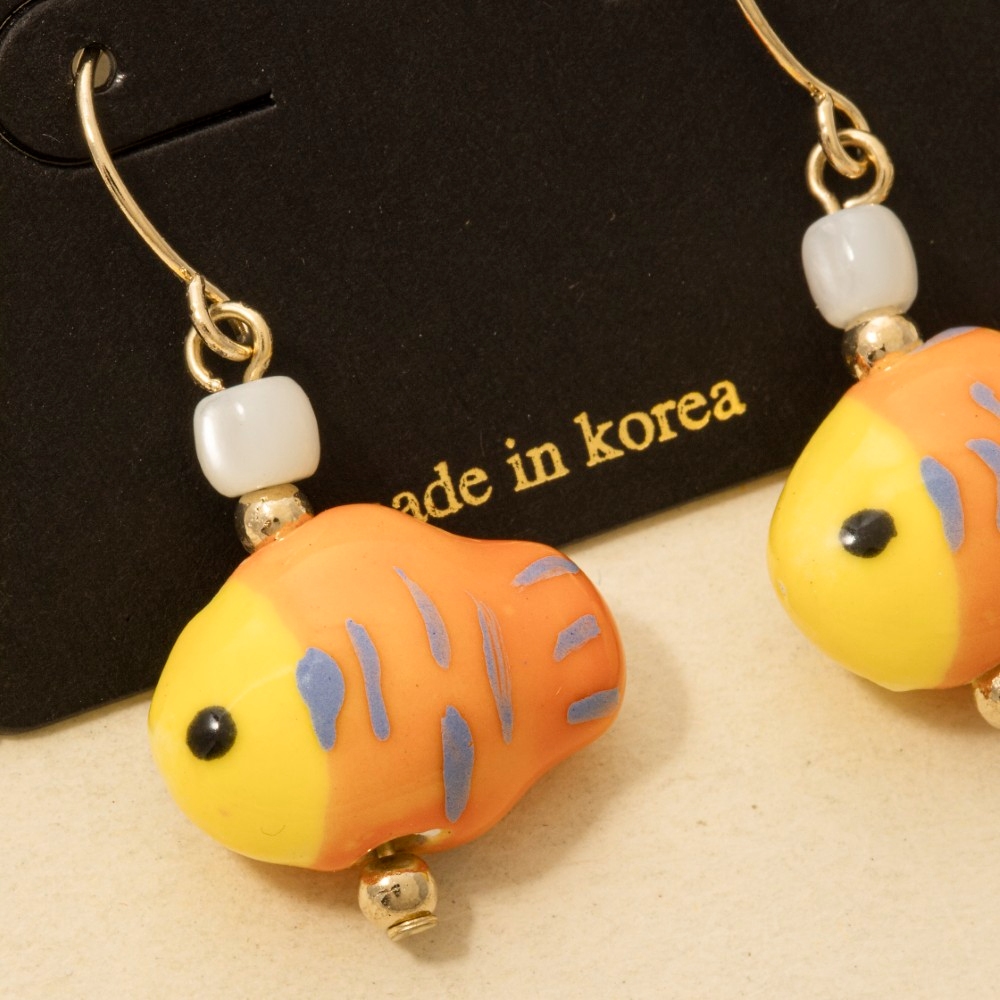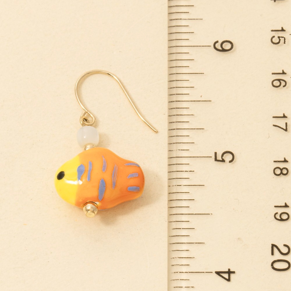 - A classic design with a contemporary twist, this pair of drop earrings adds a distinctive ceramic cute fish design. Unleash the charm of this versatile pair of drop earrings, effortlessly turning any outfit into a fashion statement. Available in GOLD. This item is sold in packs of 1.