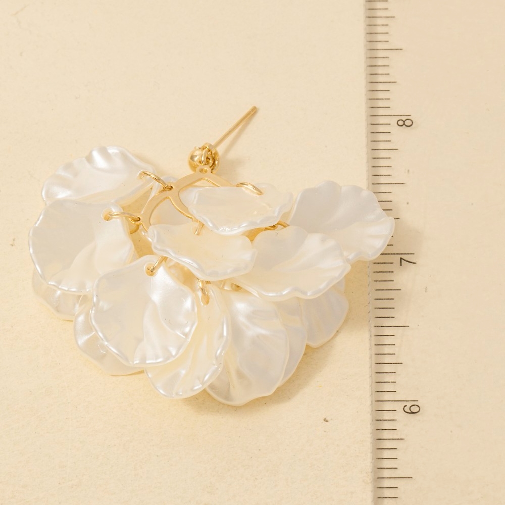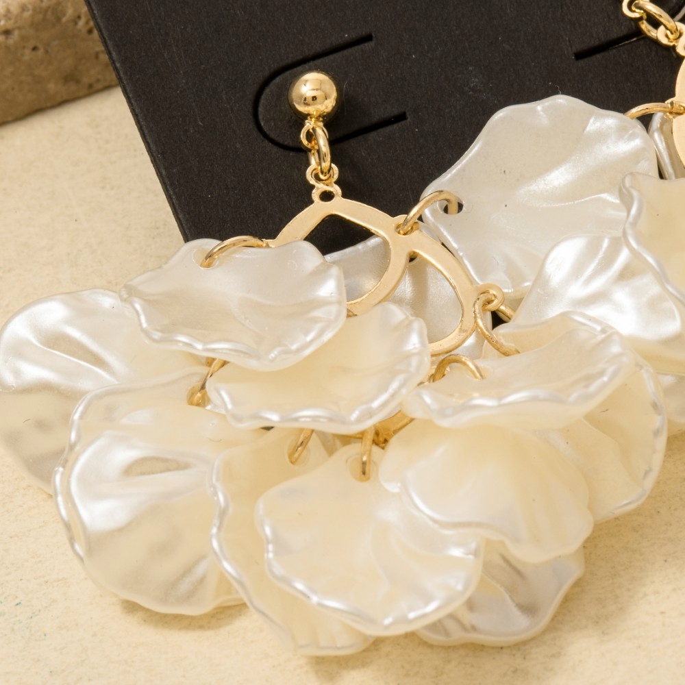 • Effortlessly chic and sophisticated, this pair of dangle earrings incorporates a flawless clustered acrylic petals design. The perfect way to elevate any outfit, this pair of dangle earrings adds a touch of elegance and style. Available in G. This item is sold in packs of 1.