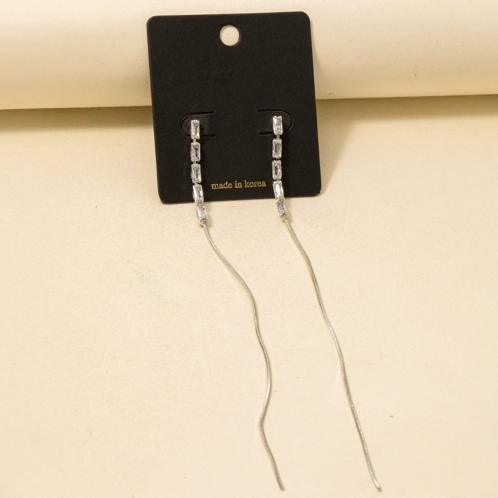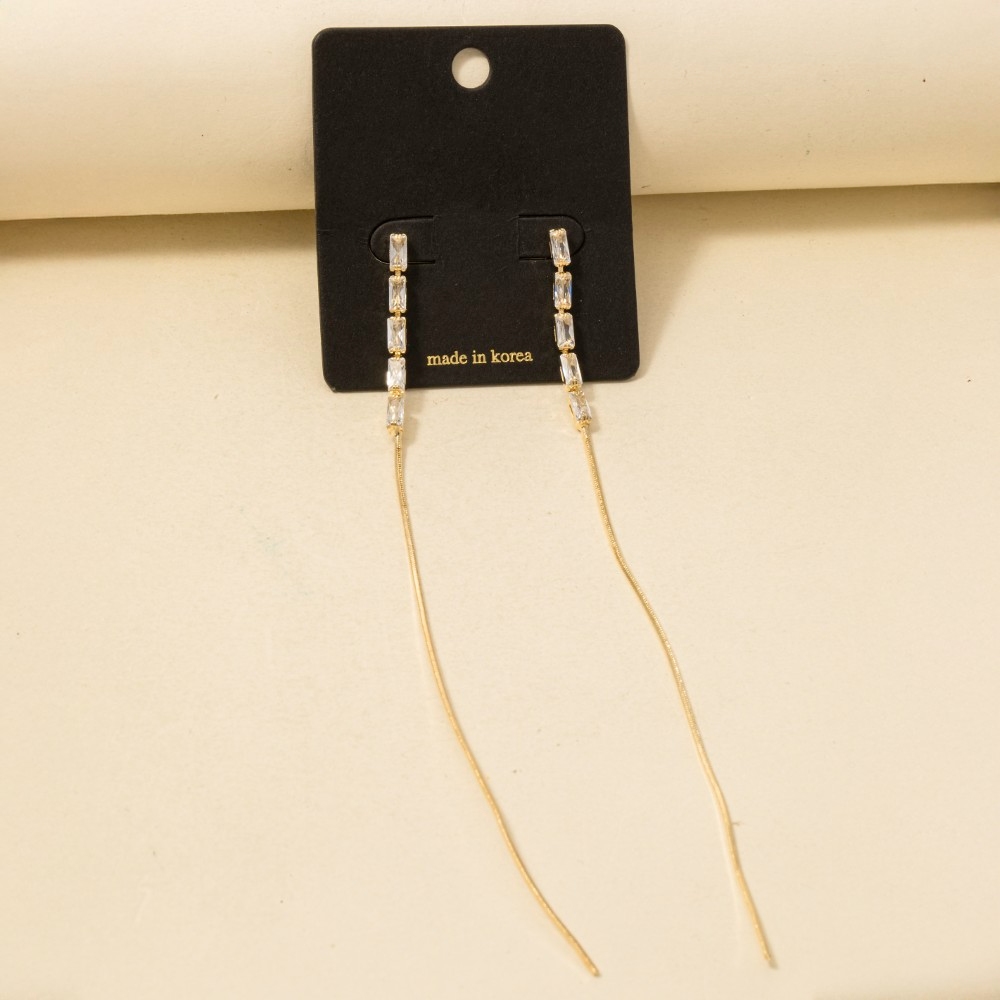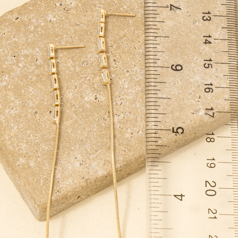 • Add some edge to your wardrobe, this pair of dangle earrings displays a unique cz baguette and dainty box chain long design. Elevate your fashion ensemble effortlessly with this versatile pair of dangle earrings, a stylish choice for the modern trendsetter. Available in G, S. This item is sold in packs of 1.