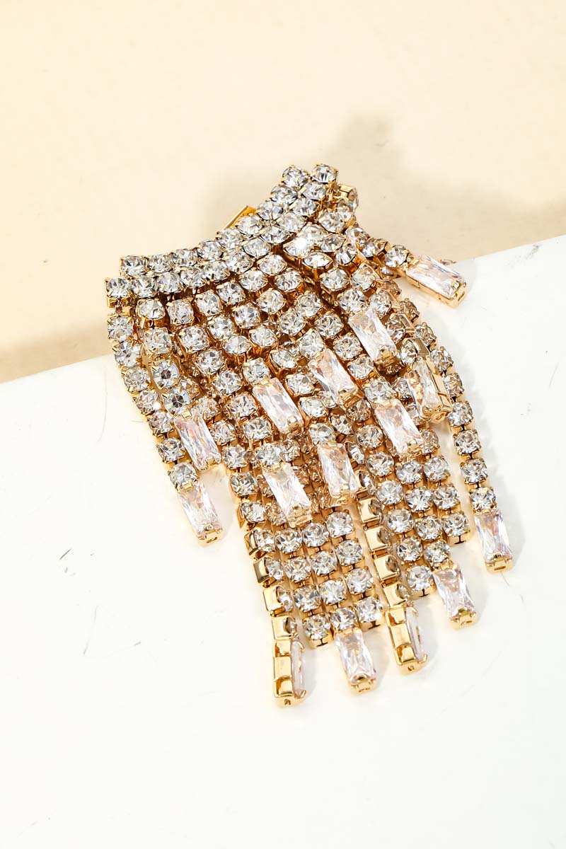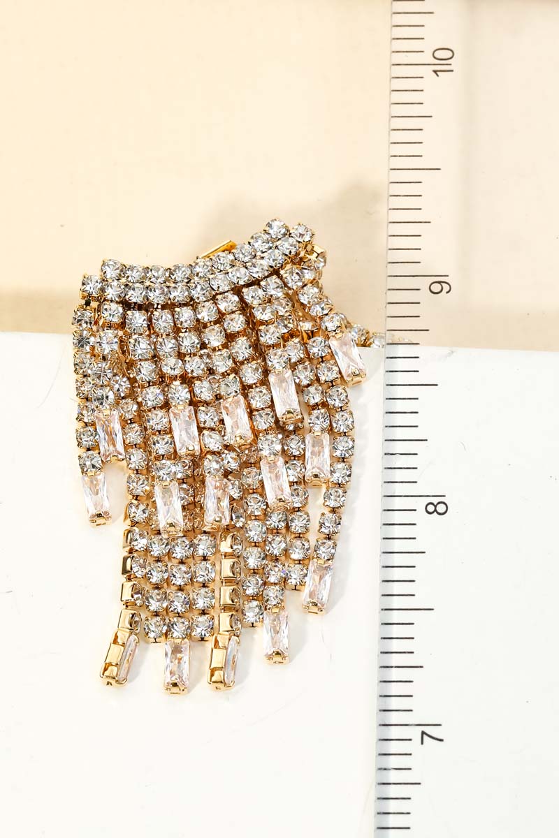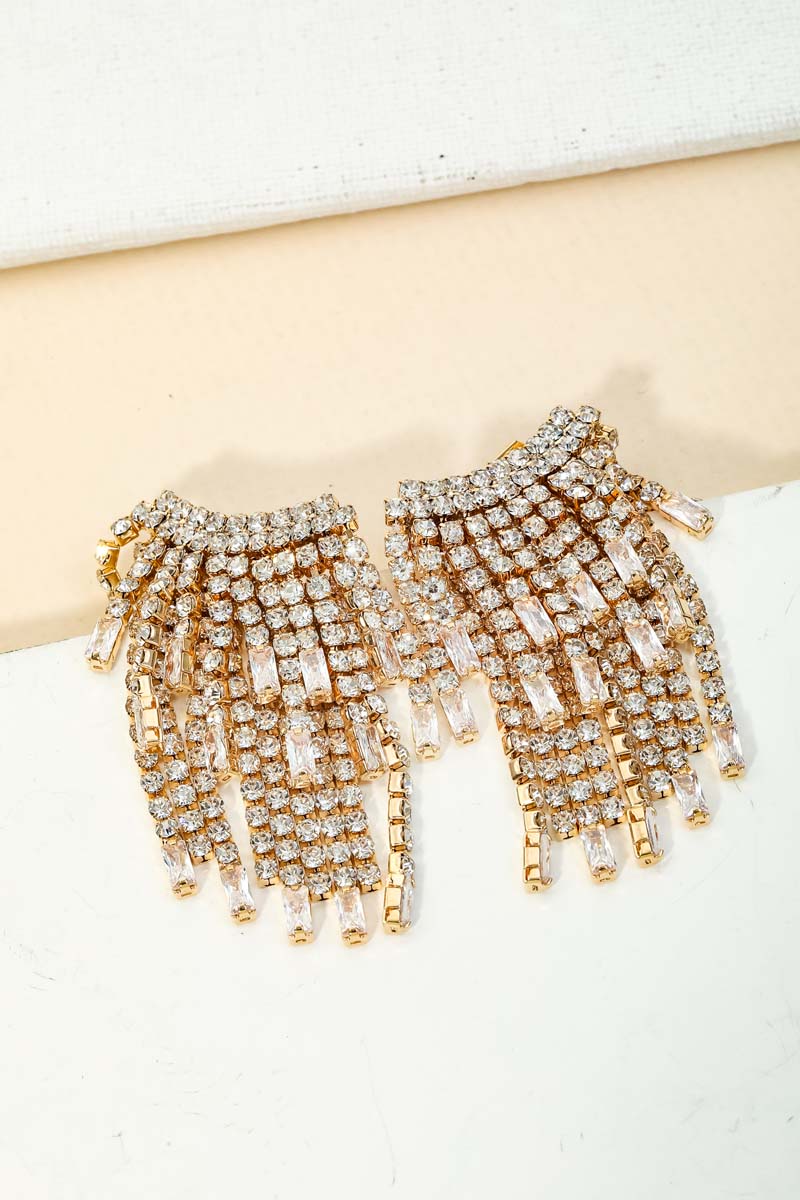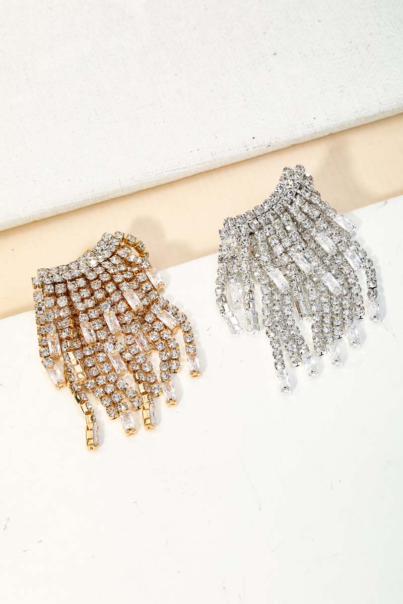 • A stunning must have pair of earrings that features a unique dainty rhinestone fringe earrings design. This is the perfect gift for a special someone. Available in G and S.