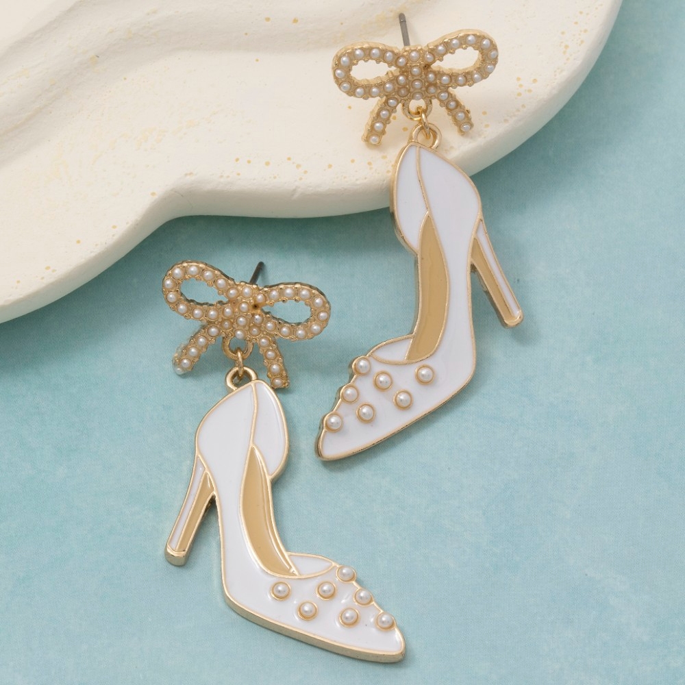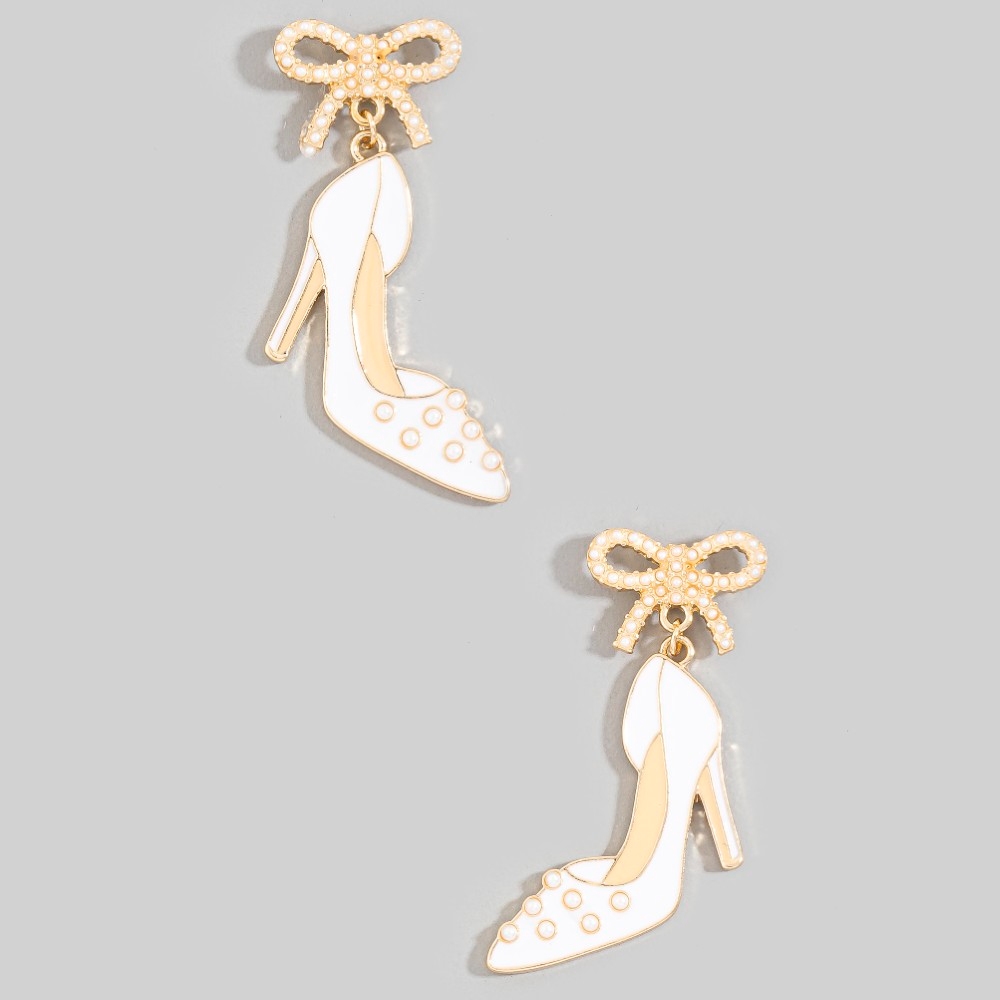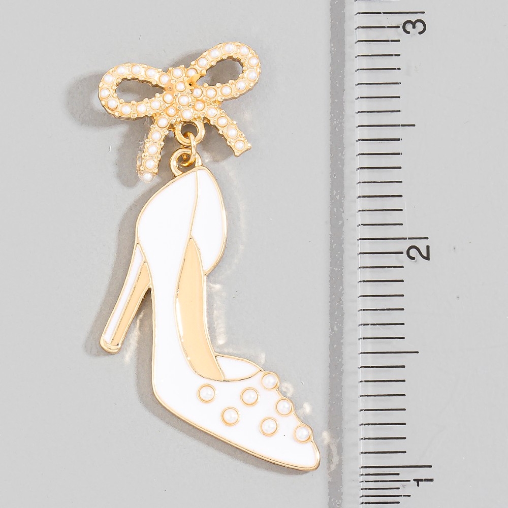 A classic design with a modern twist, this pair of dangle earrings includes a stunning enamel high heels and bow stud design. Experience the transformative power of this versatile pair of dangle earrings, effortlessly enhancing the overall aesthetic of your outfit. Available in WHT. This item is sold in packs of 1.