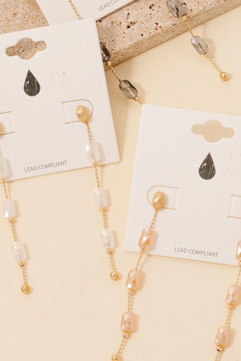 • Add a touch of elegance and glamour to your look, this pair of dangle earrings reveals an intricate faceted glass bead chain design. This item is the perfect finishing touch to any outfit, adding a touch of glamour and sophistication. Available in BD, TPZ and WHT. This item is sold in packs of 1.