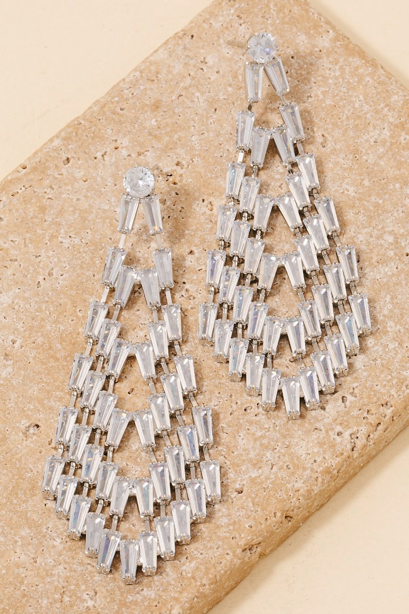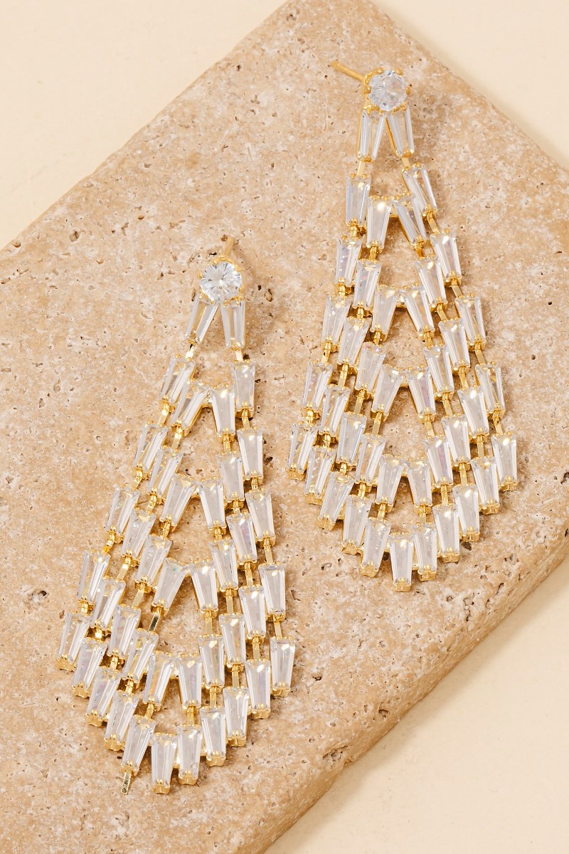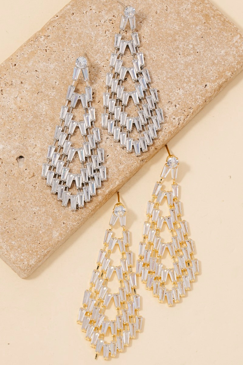 • Make a bold statement, this pair of dangle earrings embodies a sophisticated glass baguette pave tear design. This item is perfect for anyone who loves to accessorize and add some personality to their outfits. Available in GD and S. This item is sold in packs of 1.