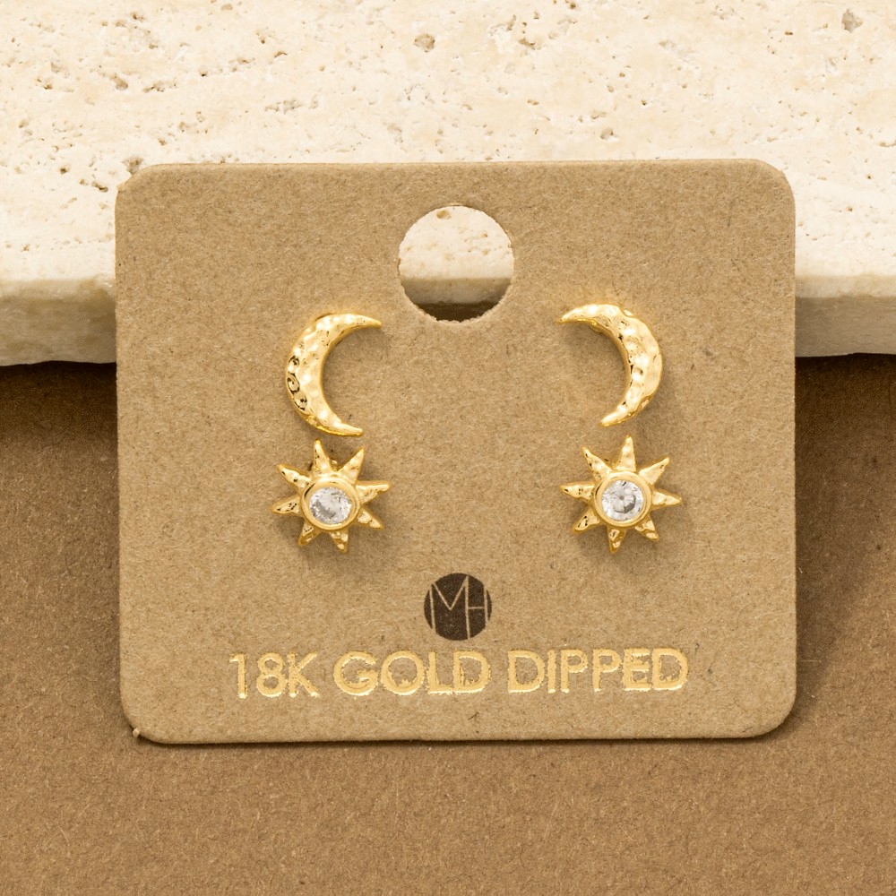• This piece is designed to be both stylish and functional, this pair of earrings boasts a magnificent gold dipped cubic zirconia moon and sun set design. Embrace fashion flexibility with this versatile pair of earrings, designed to effortlessly enhance the sophistication of any outfit. Available in G, S. This item is sold in packs of 1.