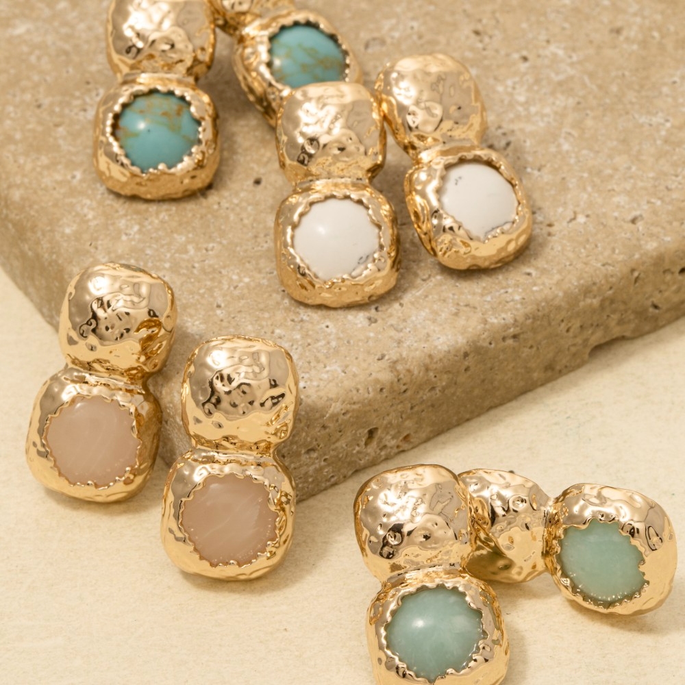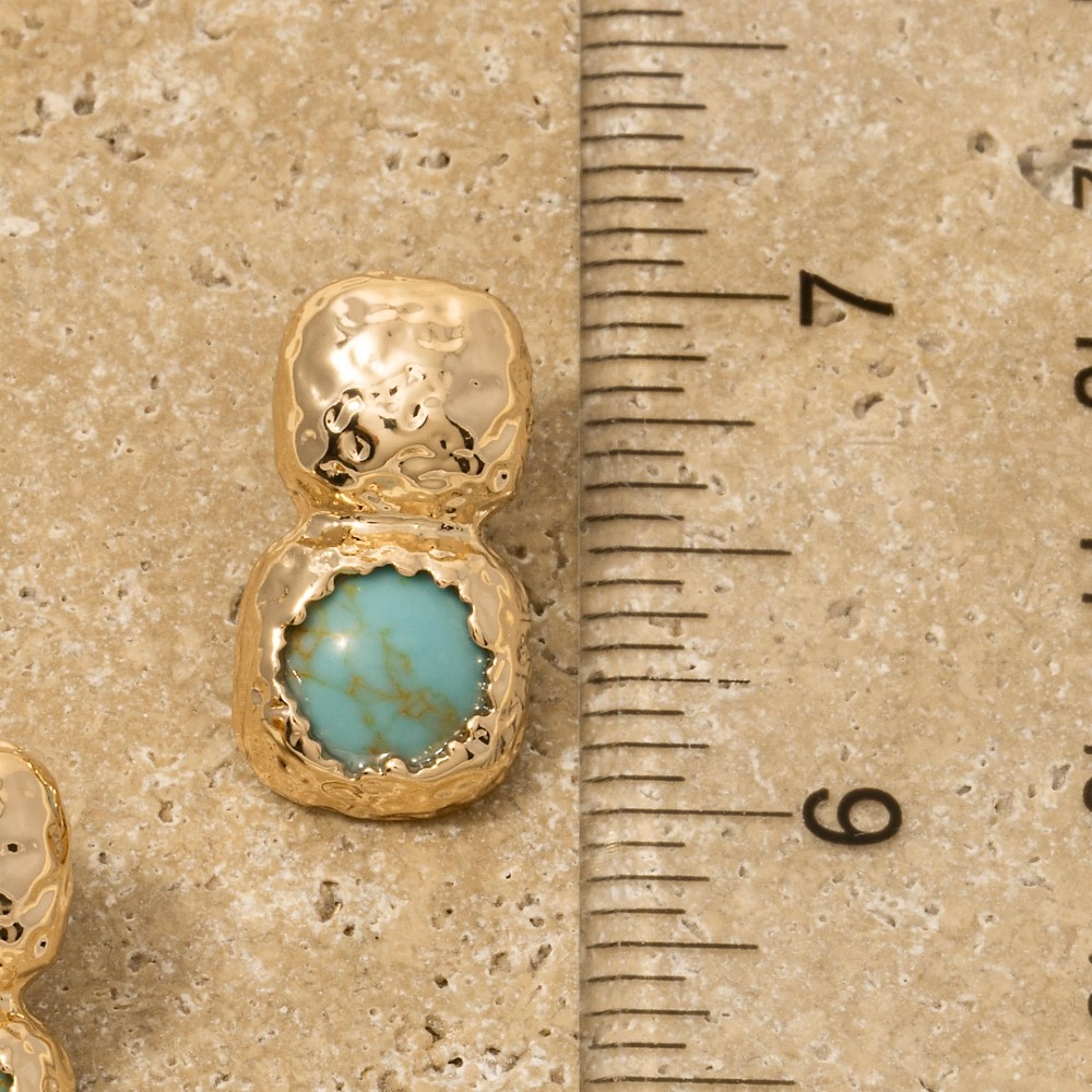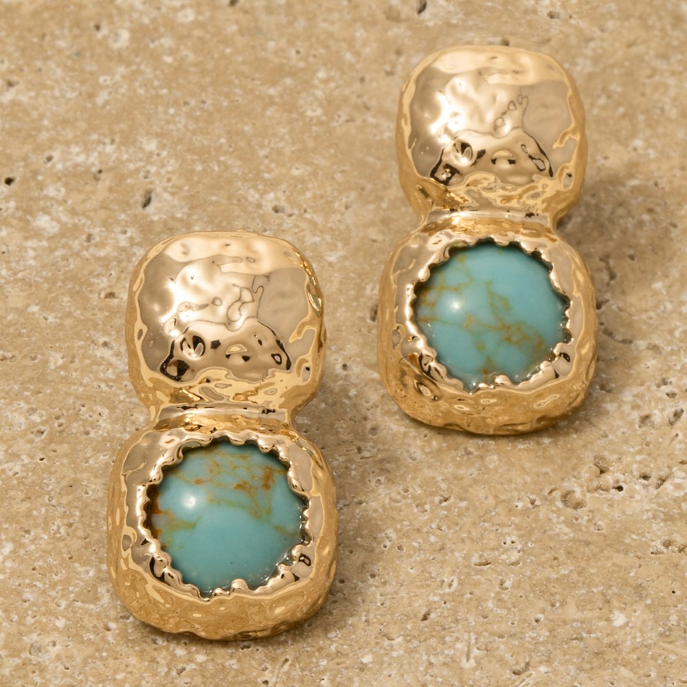 • A piece that will never go out of style, this pair of dangle earrings displays a unique hammered square and stone stud design. This item is perfect for anyone who loves to accessorize and add some personality to their outfits. Available in AMAGD, HOWLITE, ROSEGD, TQGD. This item is sold in packs of 1.