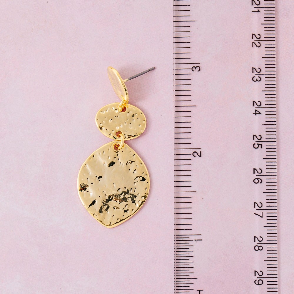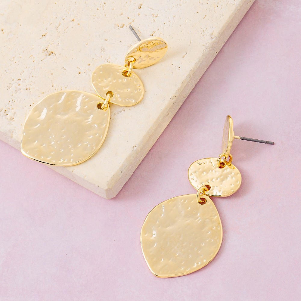 Chic, sophisticated, and always in style, this pair of drop earrings emanates an elegant hammered three disc design. This item is the perfect way to add some texture and interest to any outfit. Available in G. This item is sold in packs of 1.