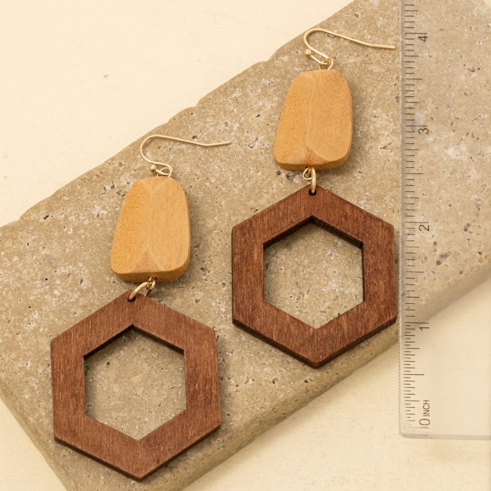 - Perfect for any occasion, this pair of drop earrings contains a special hexagon wood design. A must-have pair of drop earrings that effortlessly enhances your style, no matter the occasion. Available in MLT. This item is sold in packs of 1.