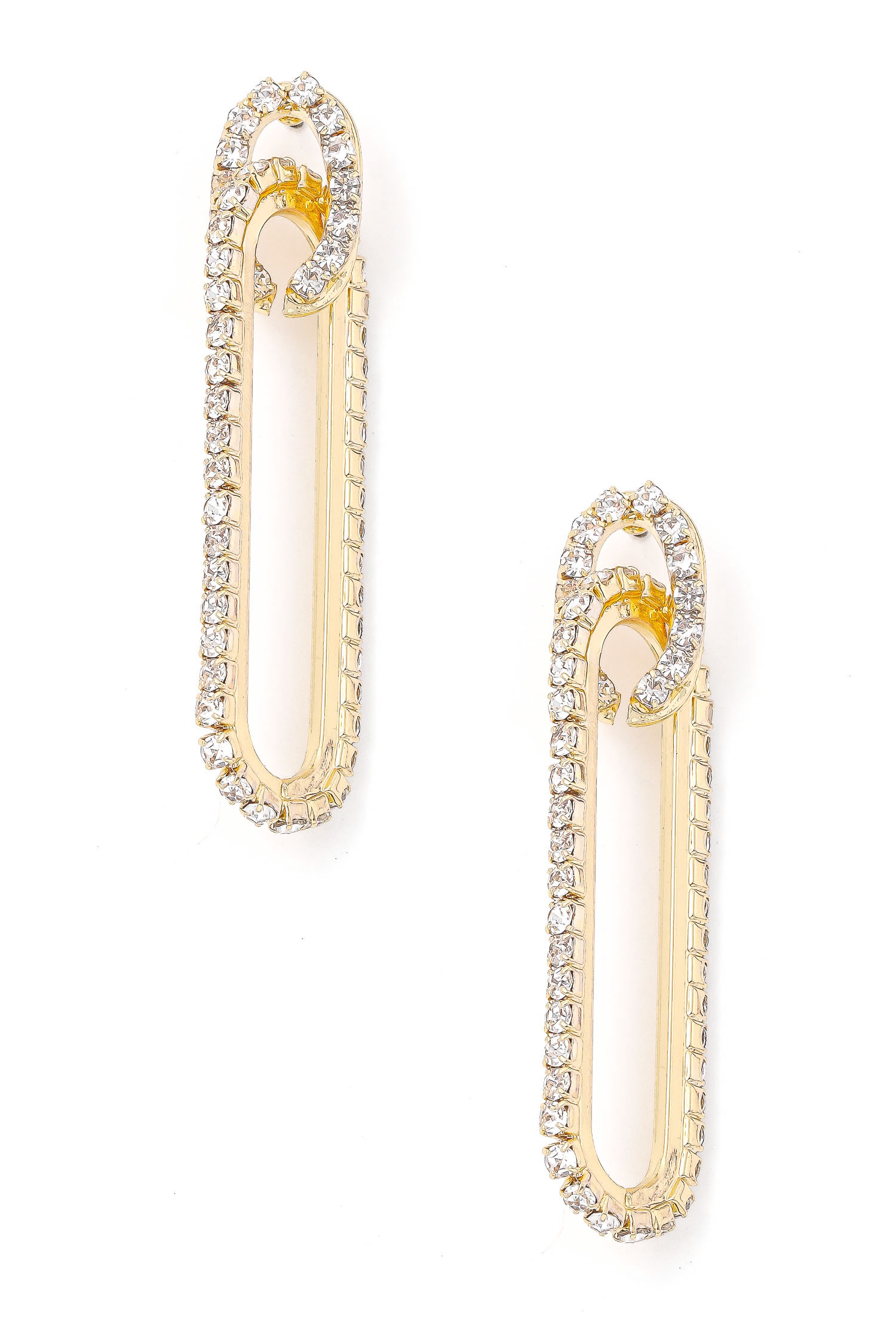 • A charming chic unique must have trending in season pair of earrings features a beautiful interlocked rhinestone drop earrings design. A beautiful gift for a loved one! Available in G and S.