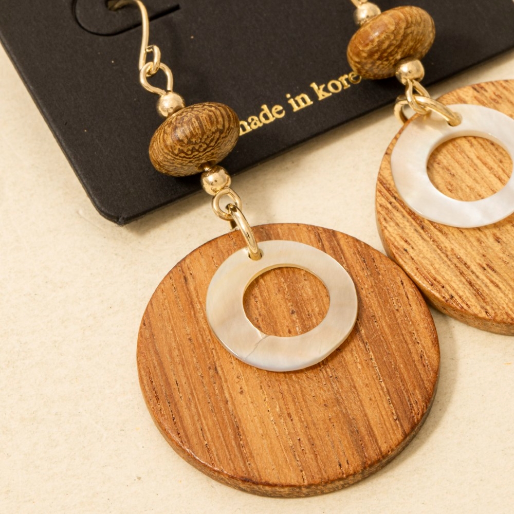 This pair of drop earrings is made with 5% Brass, 30% Shell and 65% Wood.