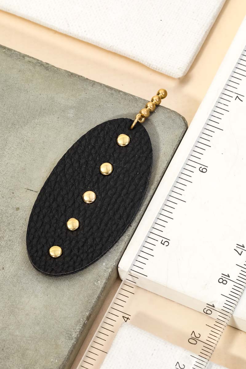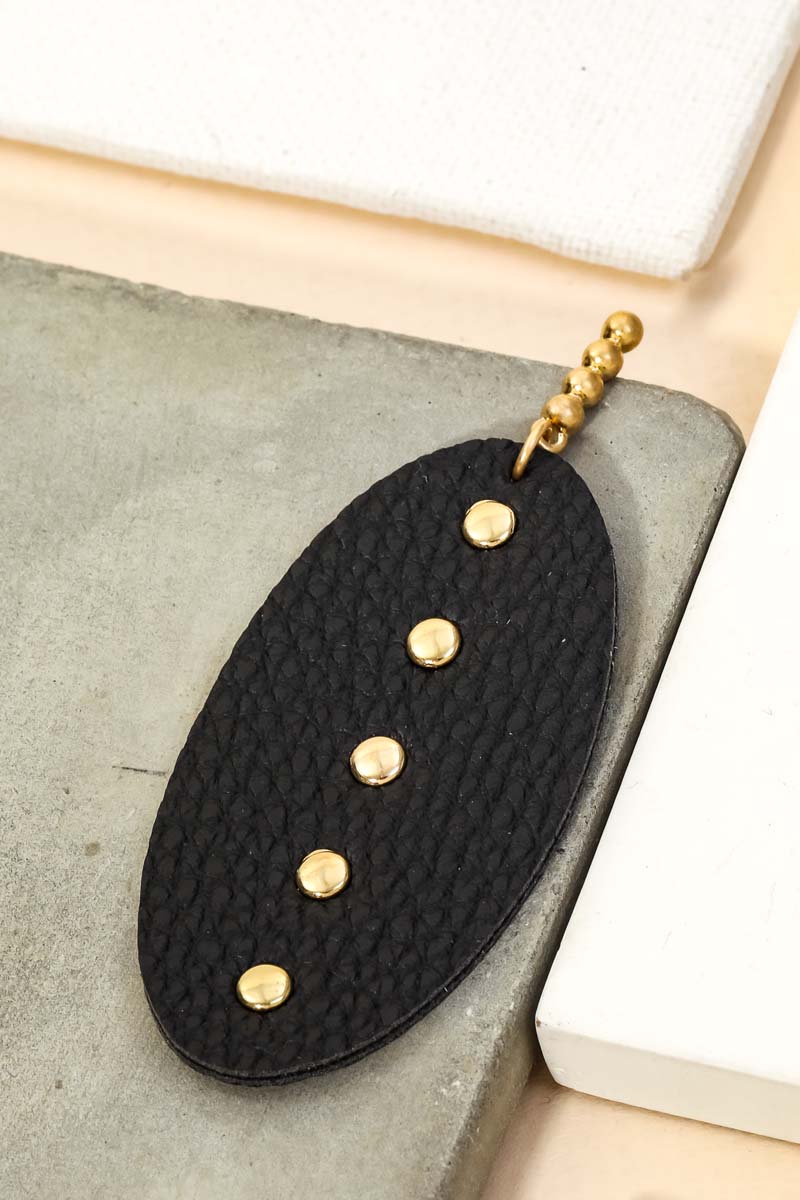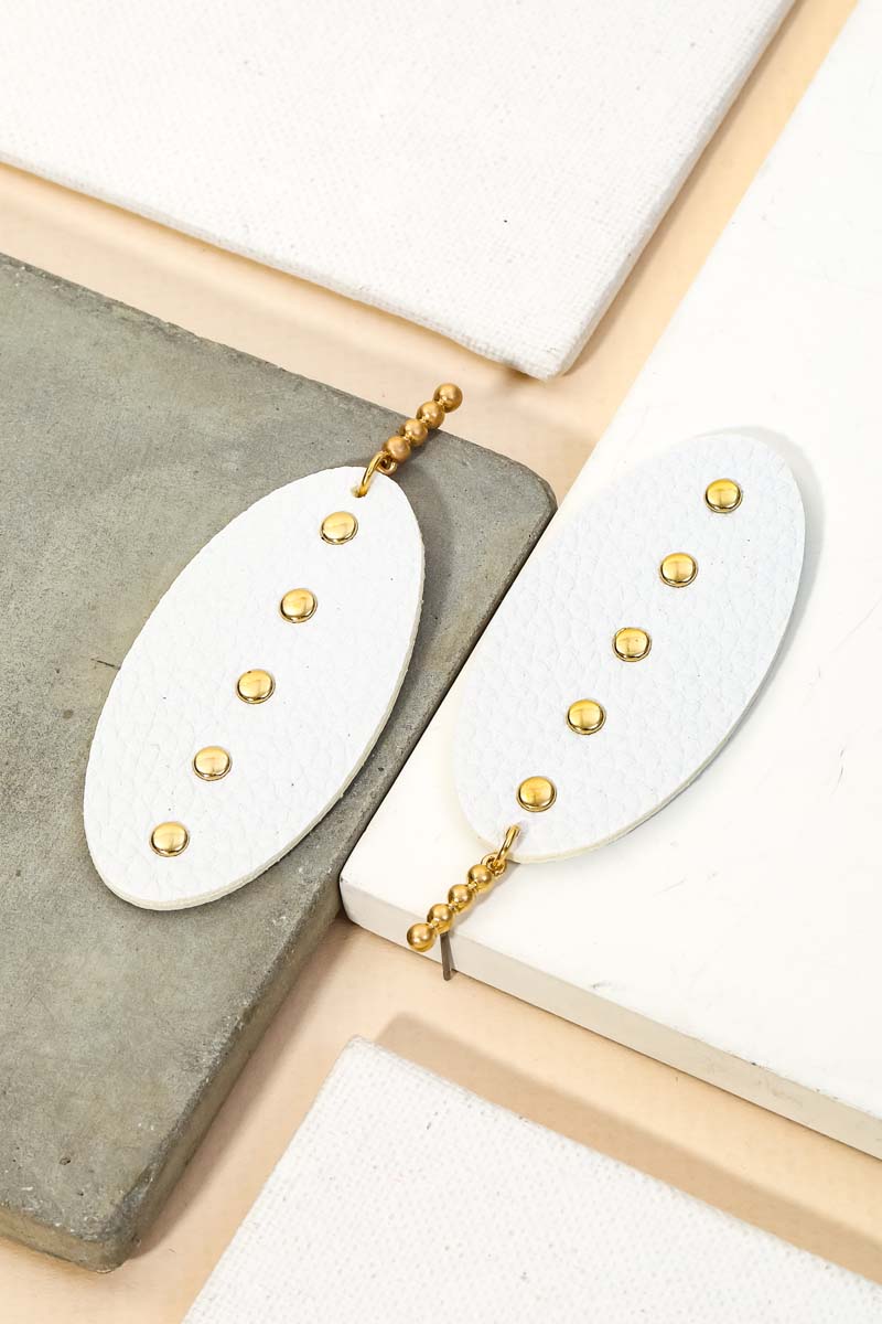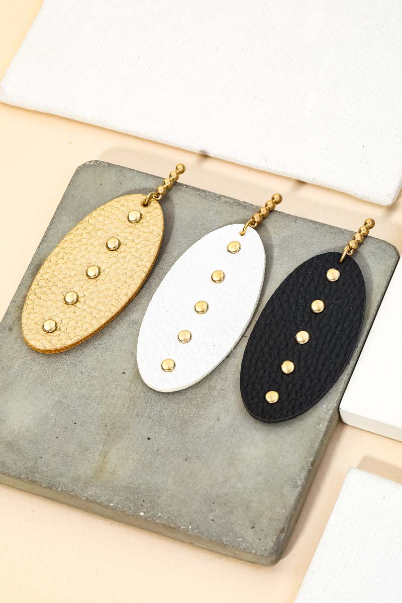 A popular giftable pair of drop earrings has a unique faux leather oval drop earrings design. Perfect for this season! Available in GD, JET and WHT.