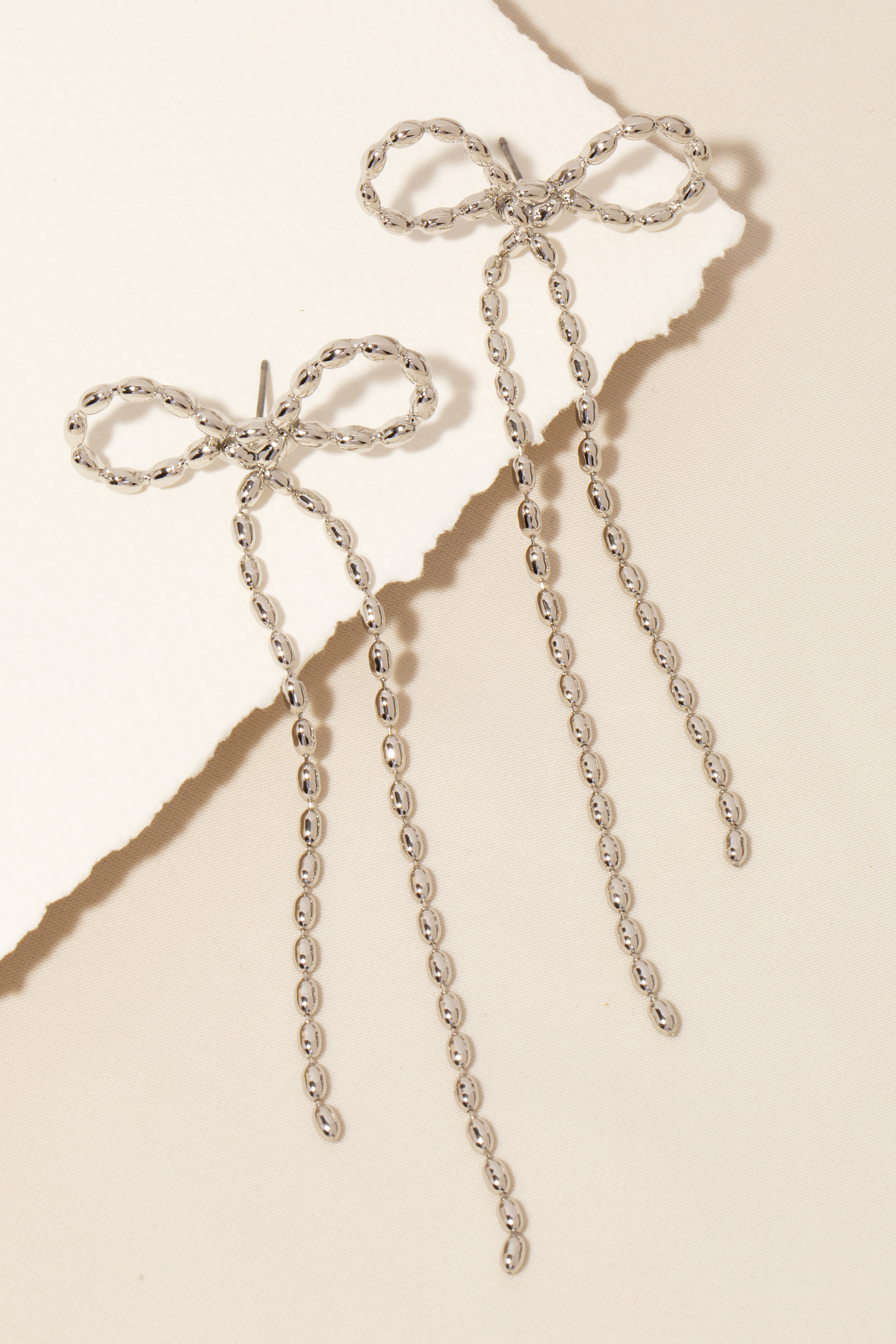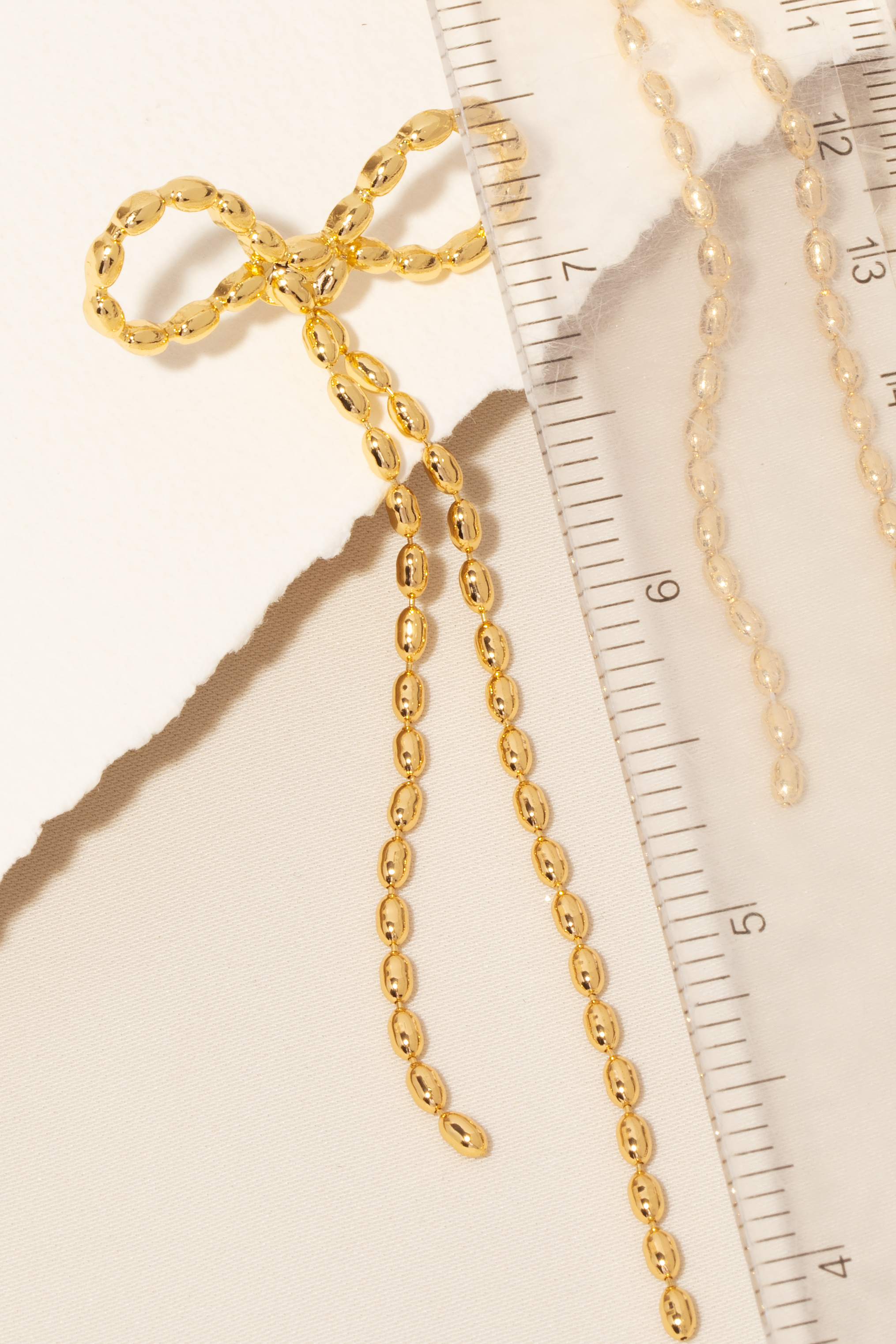• Add a touch of luxury to any outfit, this pair of dangle earrings includes a stunning metallic beaded ribbon bow stud design. Infuse a hint of luxury into your daily attire with this versatile accessory, a must-have for those who appreciate timeless elegance. Available in G and RH. This item is sold in packs of 1.