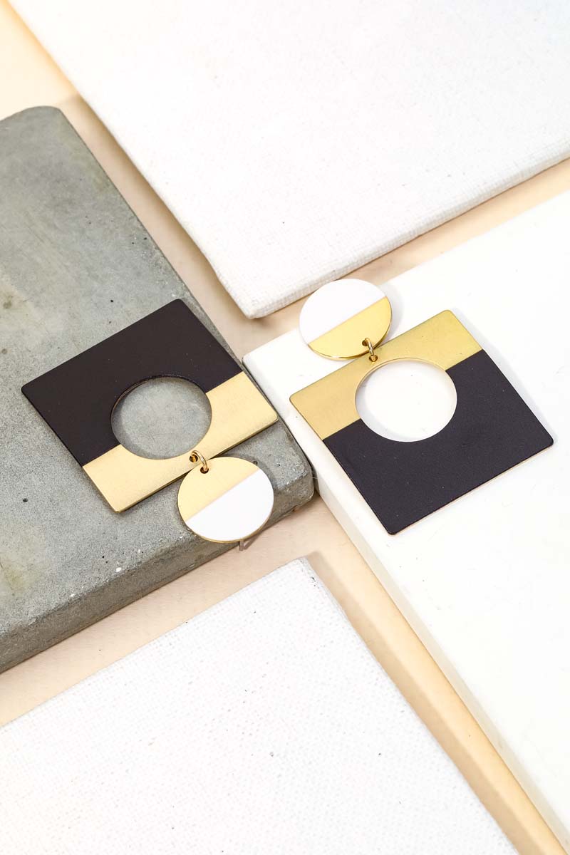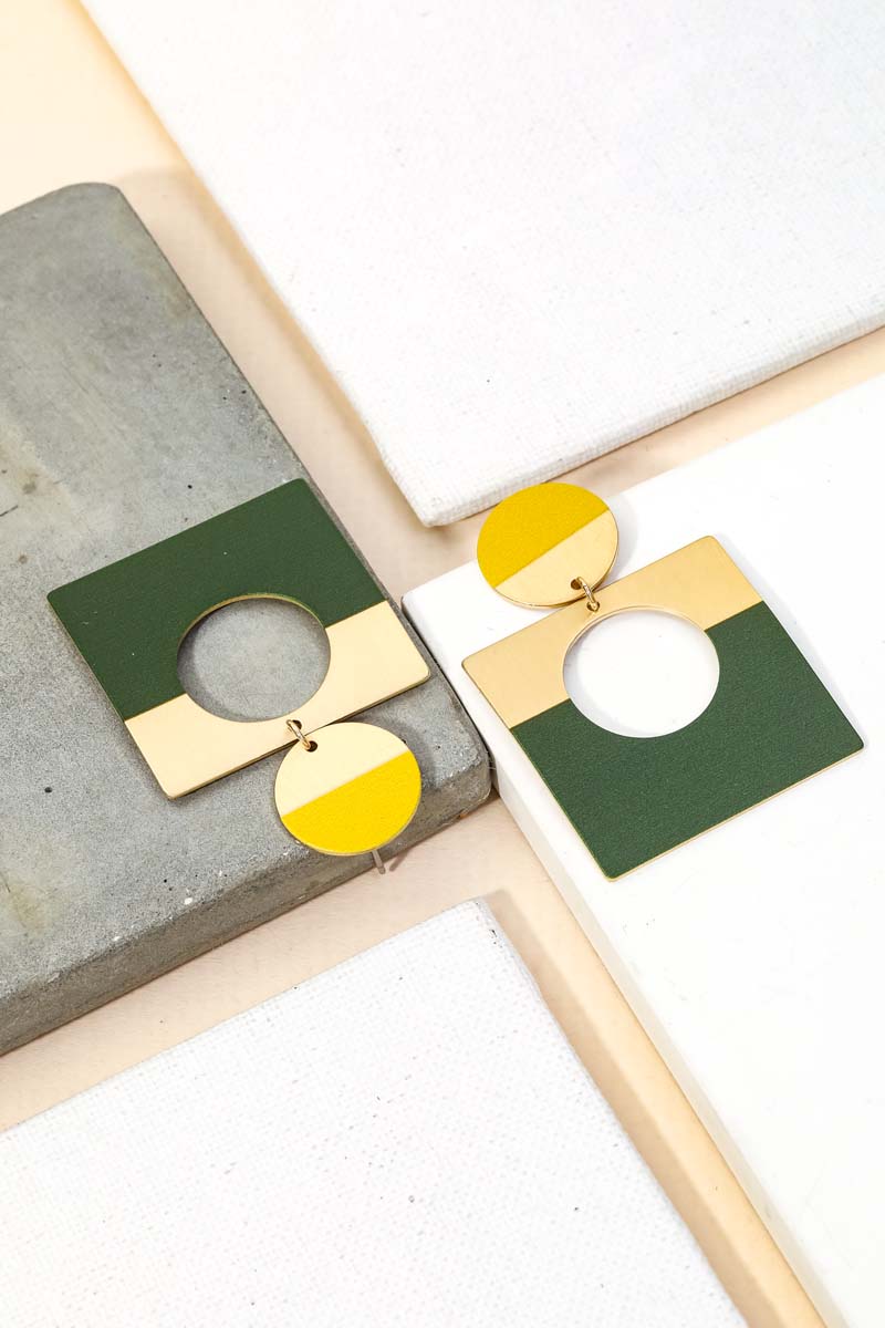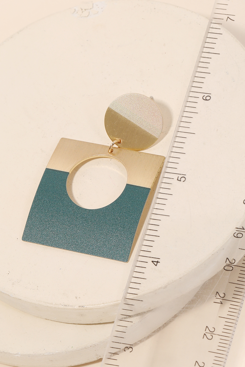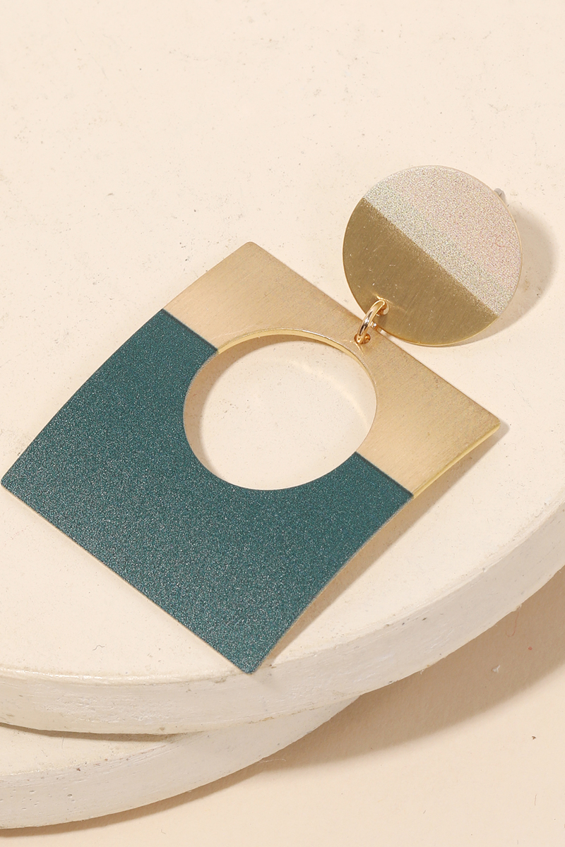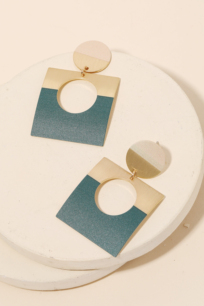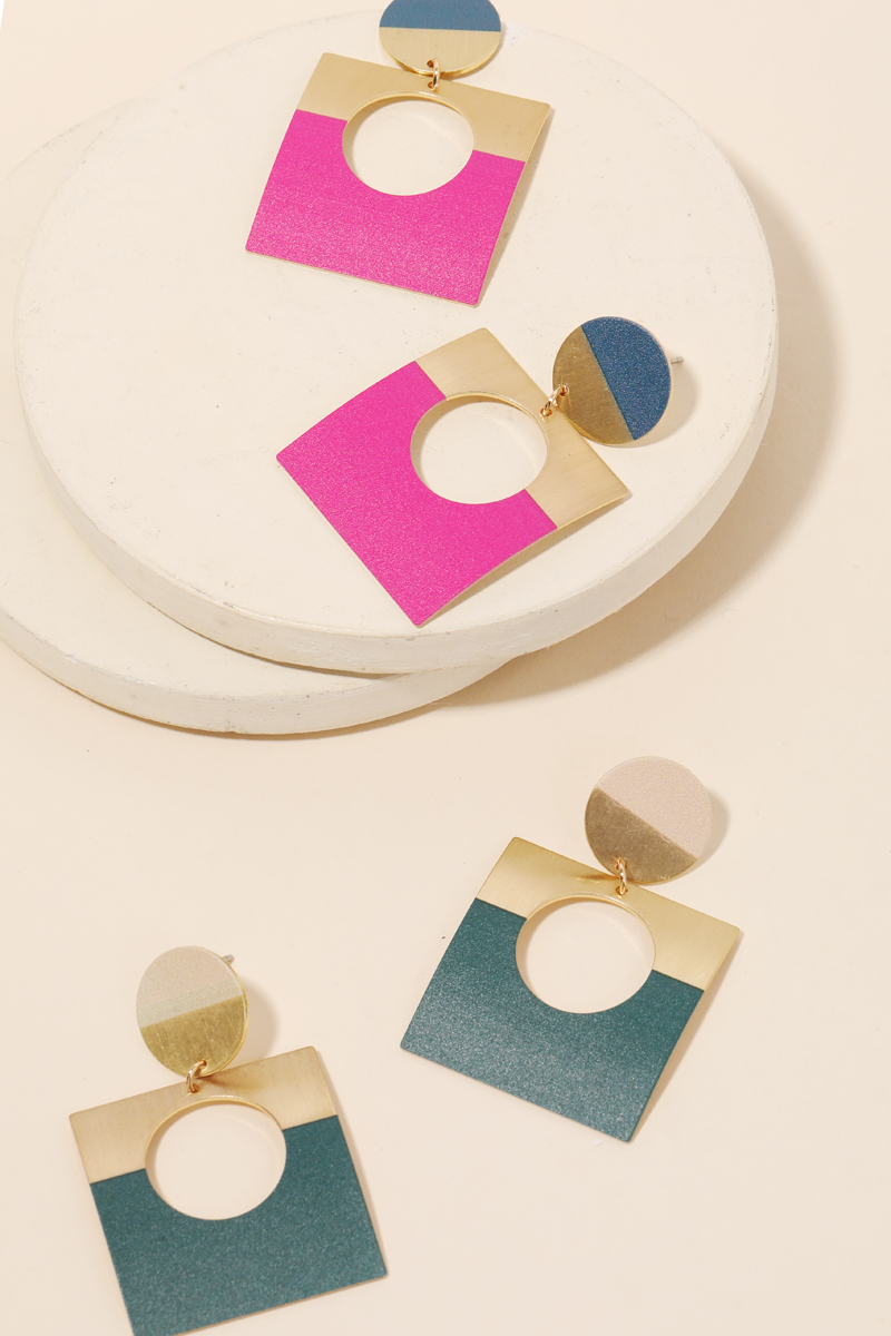 - Classy, Flashy, and everything in between must have pair of drop earrings that features a metallic geometric square drop earrings design. A perfect gift for the Spring season. Available in F, GBK, GN and TL. This item is sold in packs of 1.