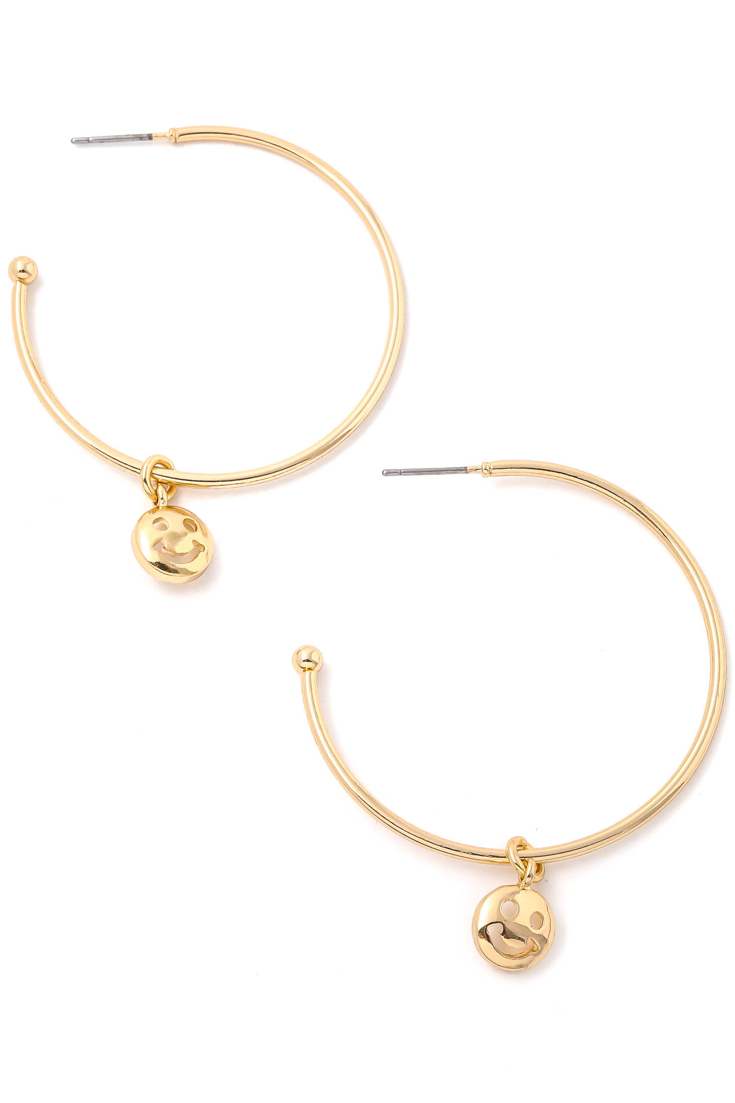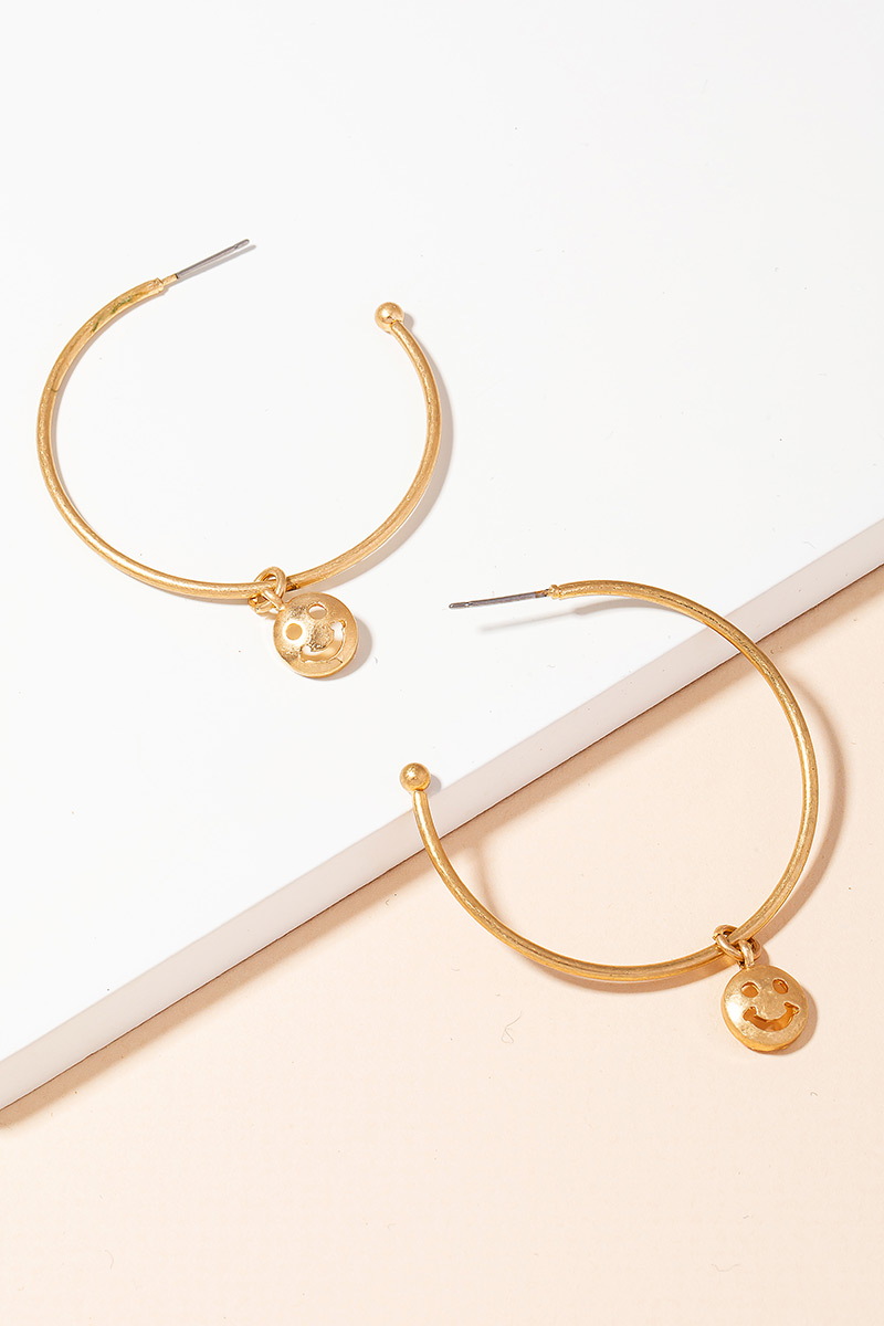 • "A new soon to be trending must have pair of hoop earrings features a beautiful mini smiley face coin hoop earrings design. Great for any occasion and casual event! "