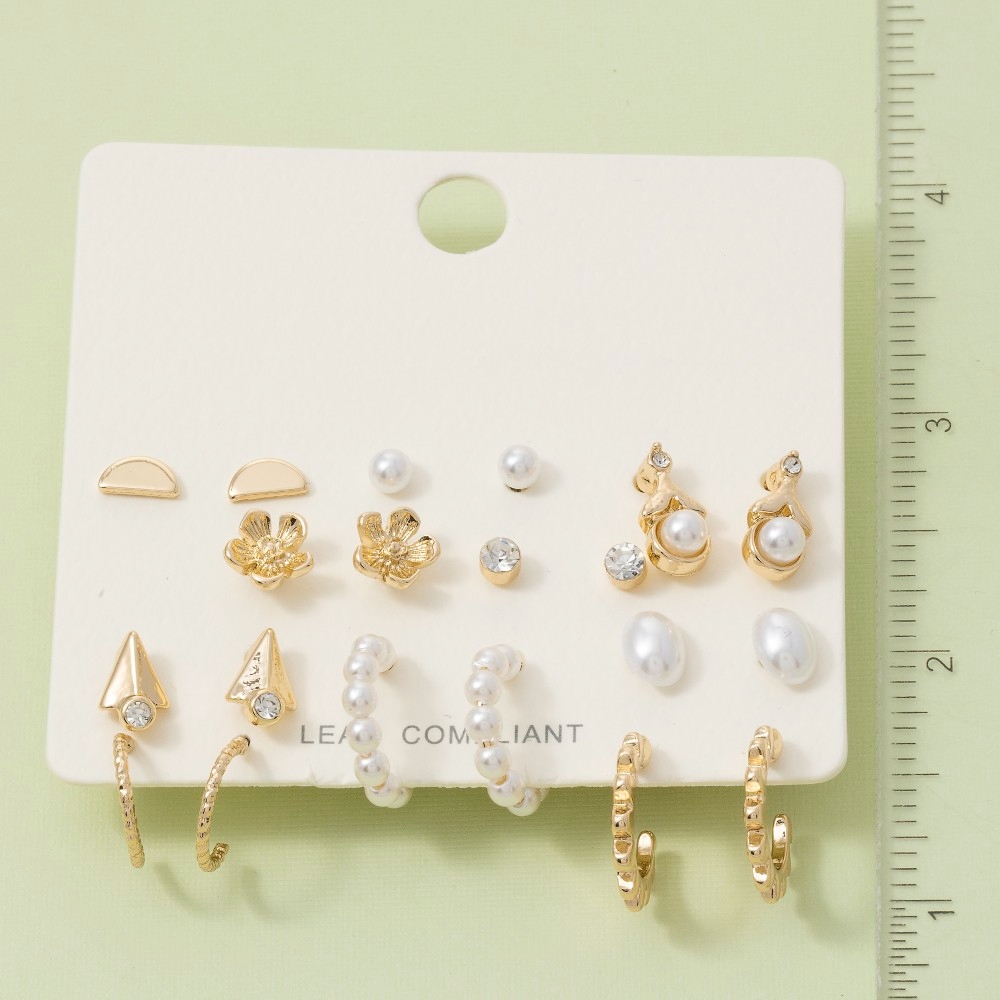 • Add a touch of luxury to any outfit, this pair of earrings comes with a special mixed pearl and metallic 10 pair set design. This item is perfect for anyone who loves to accessorize and add some personality to their outfits. Available in G. This item is sold in packs of 1.