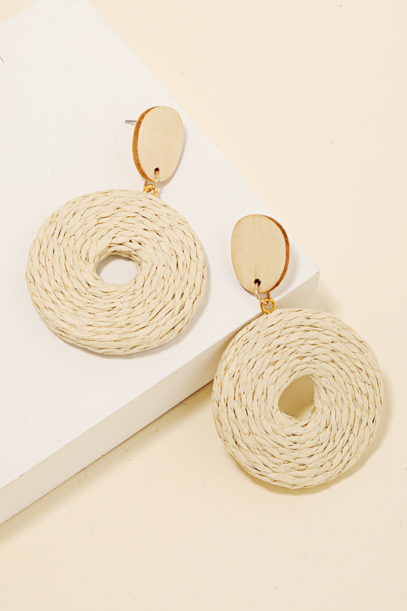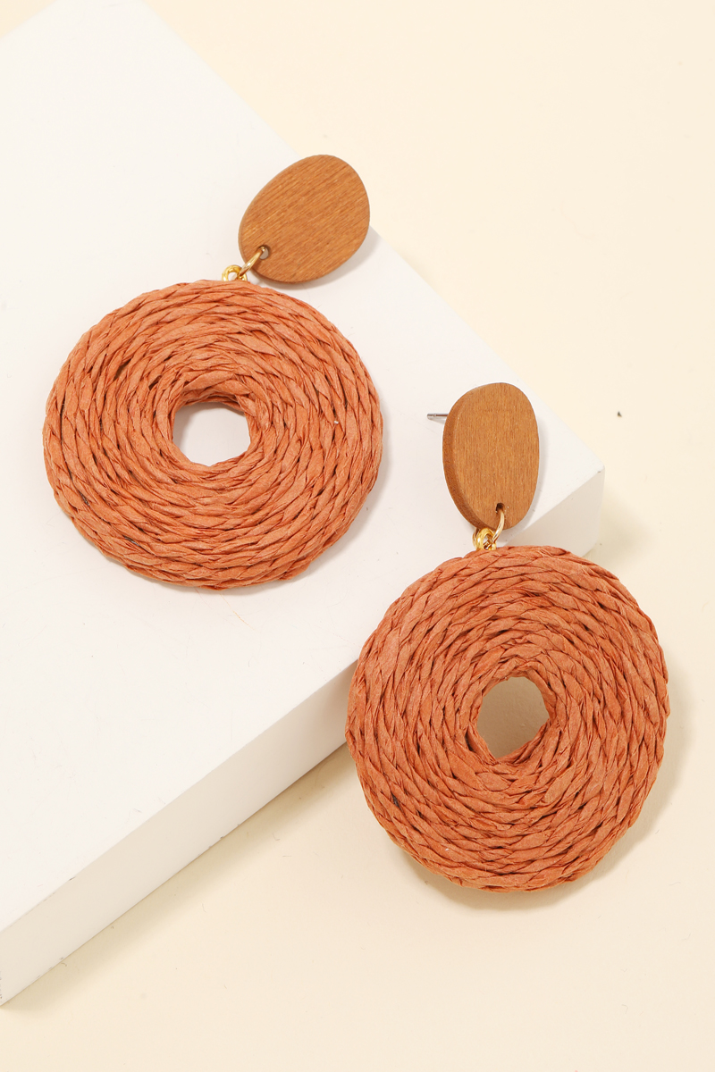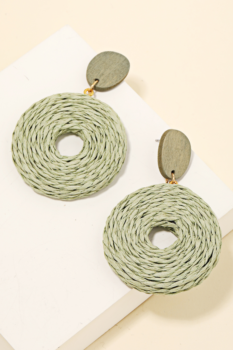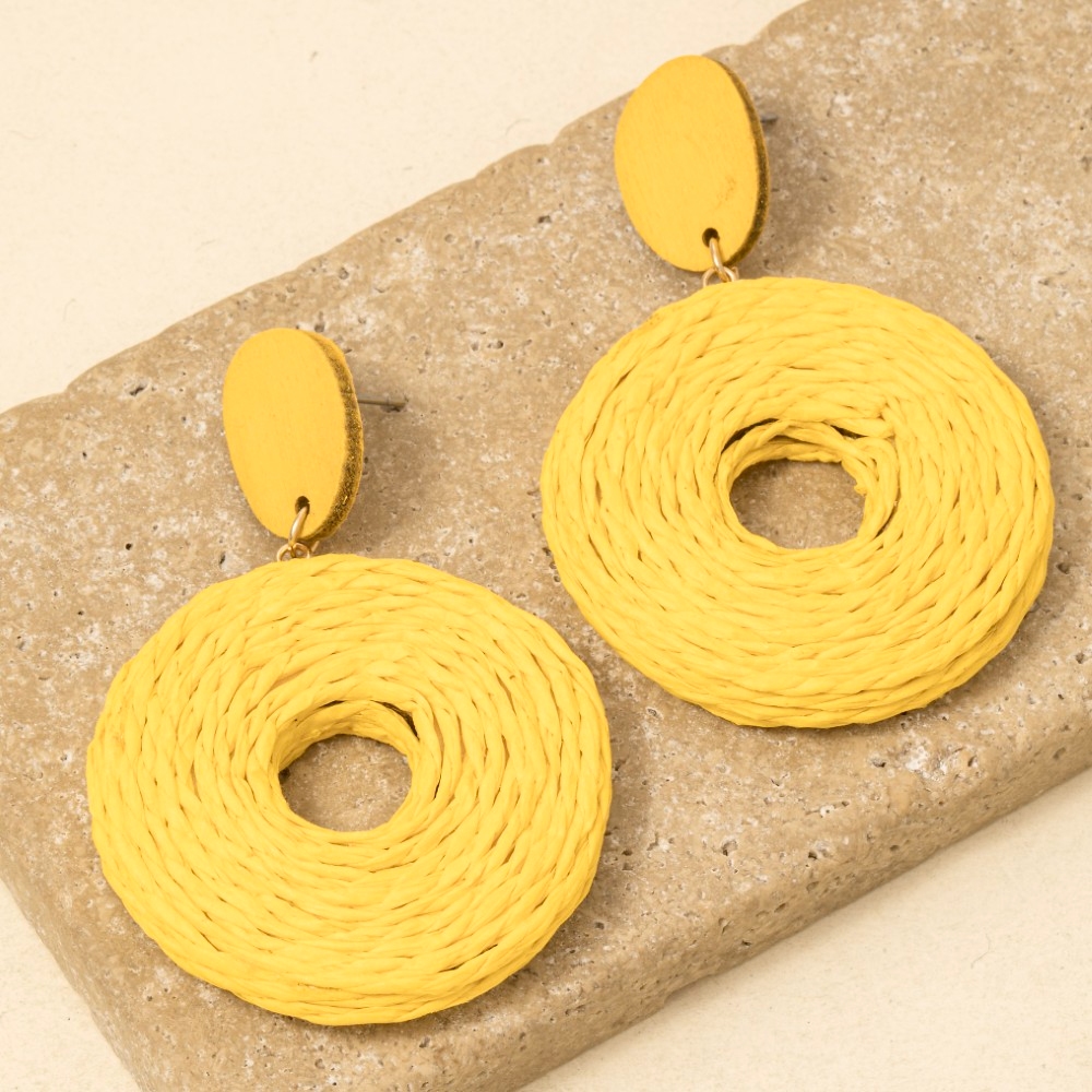Effortlessly elevate your style, this pair of dangle earrings incorporates a remarkable paper braided hoop design. Discover the magic of accessorizing with this versatile pair of dangle earrings, effortlessly upgrading the style quotient of any outfit. Available in BG, BK, IVY, LBR, NAV, YEL, PUM and SAGE. This item is sold in packs of 1.