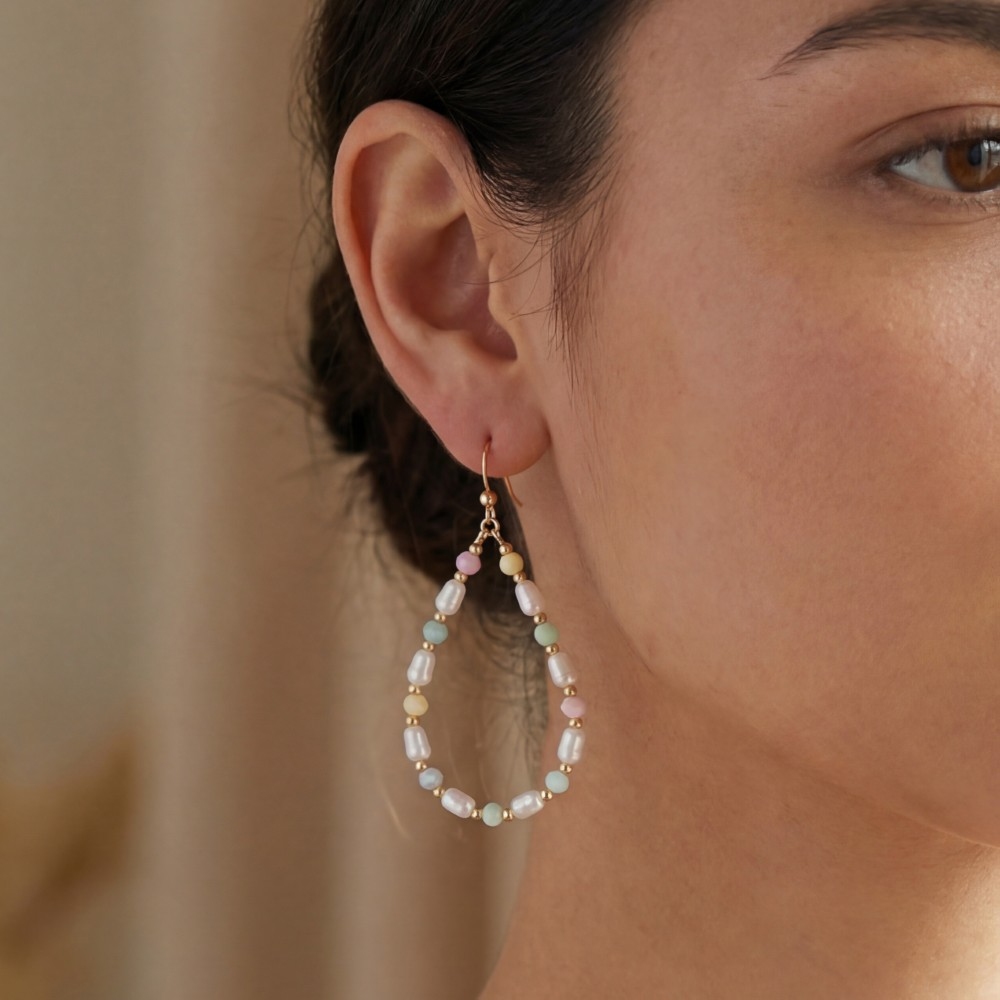 This pair of dangle earrings is made with 40% Pearl 40% Glass 20% Brass.