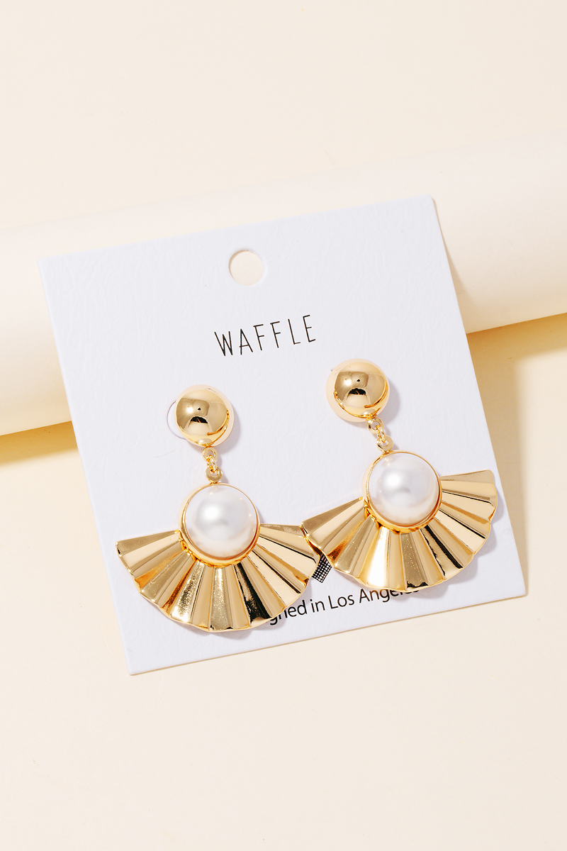 This season's must-have pair of dangle earrings, this pair of dangle earrings evokes a captivating pearl stud metallic fan design. Discover a new level of fashion versatility as this pair of dangle earrings effortlessly elevates the allure of your attire. Available in G. This item is sold in packs of 2.
