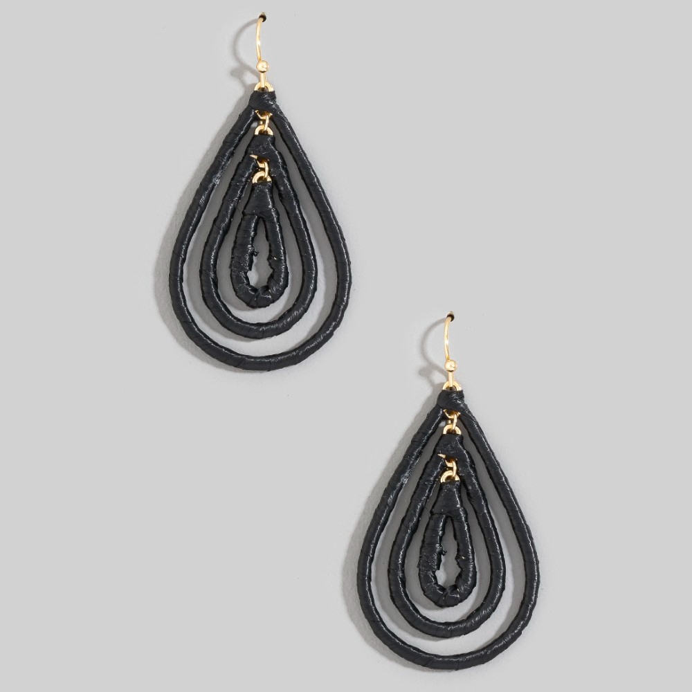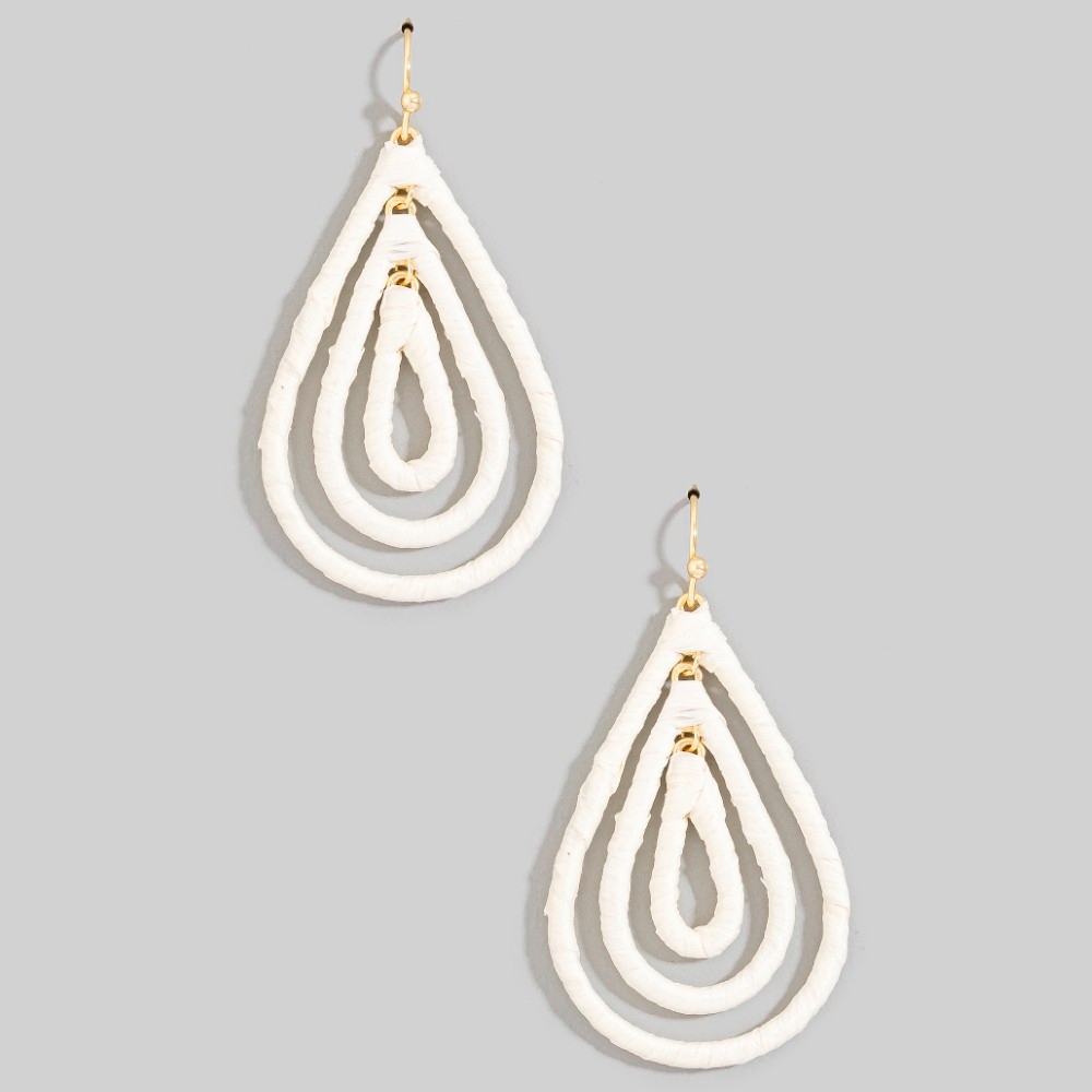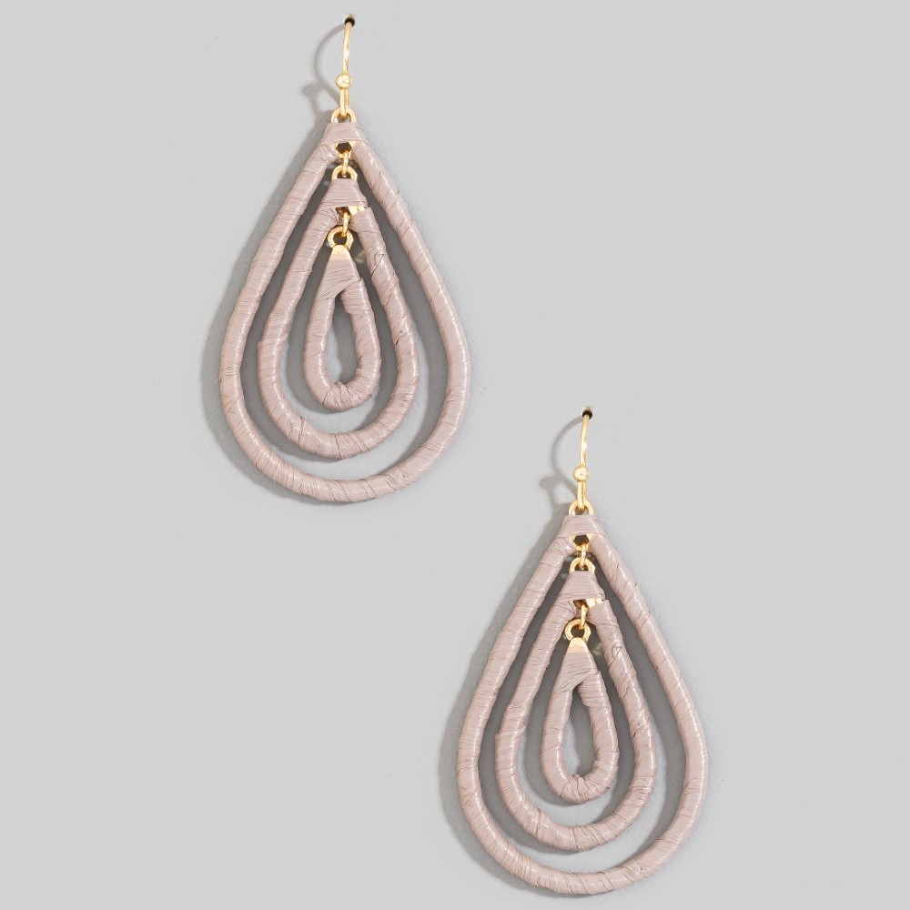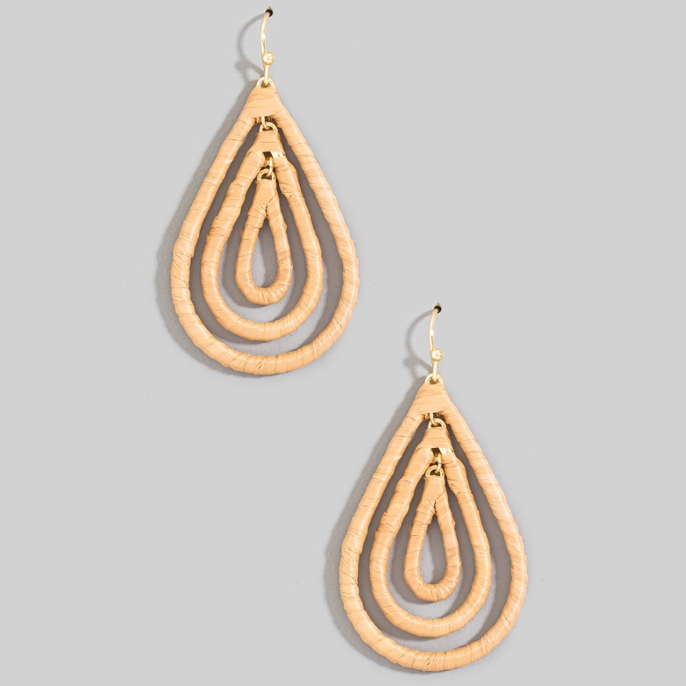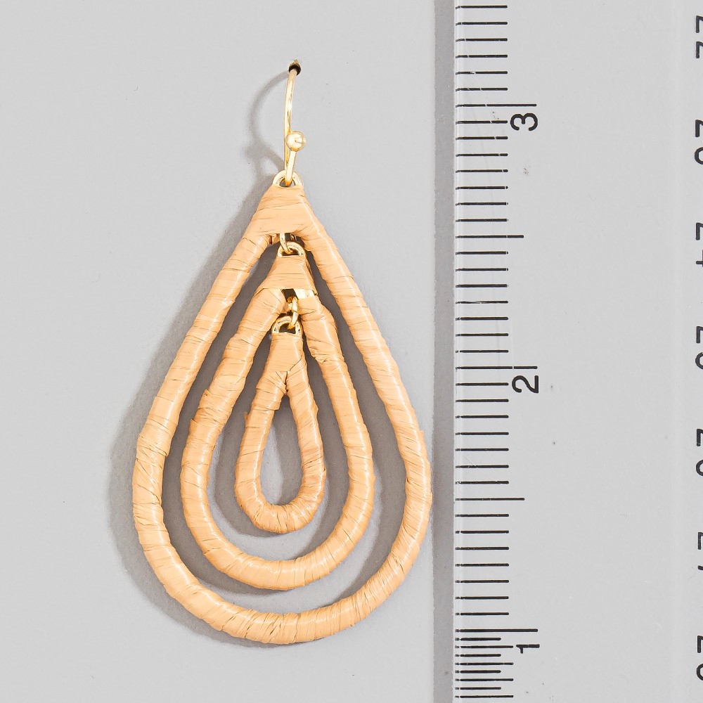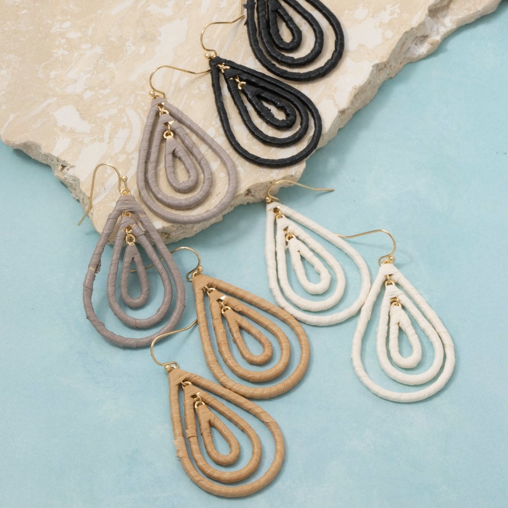 - Unleash your inner fashionista, this pair of drop earrings boasts a magnificent raffia wrapped layered teardrop earrings design. Perfect for adding a pop of color or texture to any outfit, this pair of drop earrings is a must-have. Available in BK, IVY, LBR, TAU. This item is sold in packs of 1.