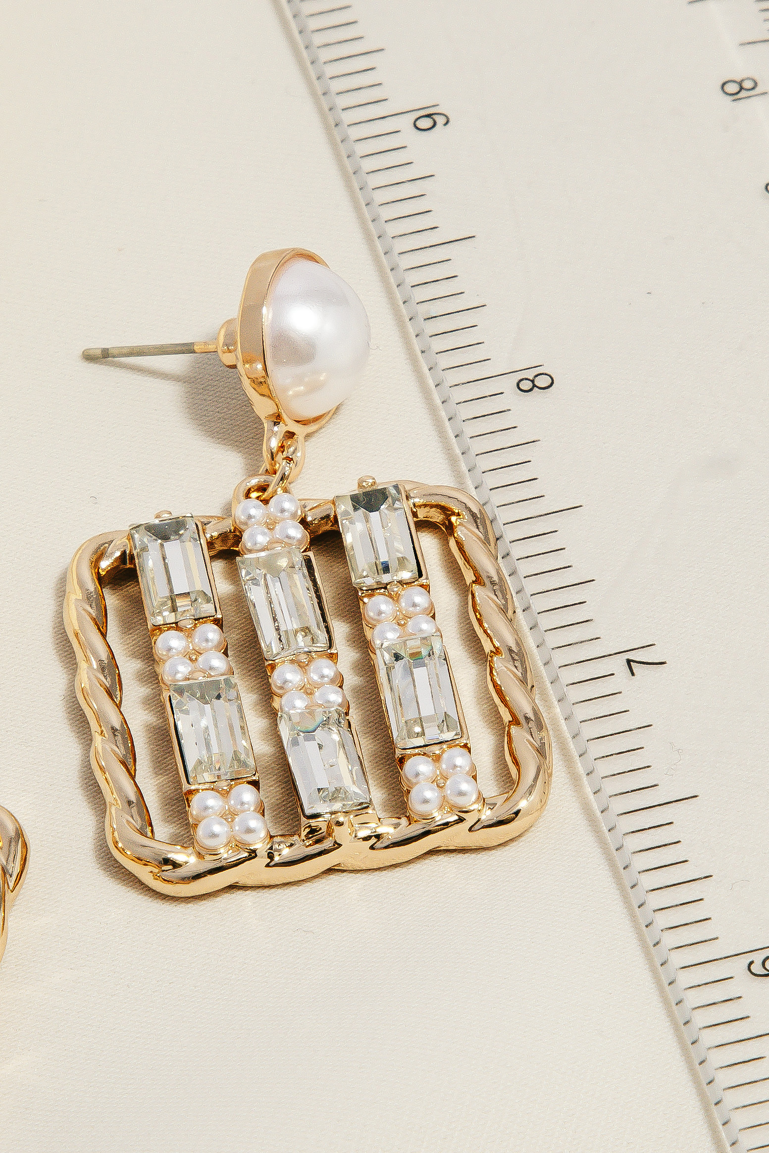 This piece is both elegant and versatile, this pair of dangle earrings incorporates a remarkable rhinestone and pearl square design. Redefine your fashion identity with this versatile accessory, a timeless piece that complements any wardrobe. Available in GLCRM. This item is sold in packs of 1.