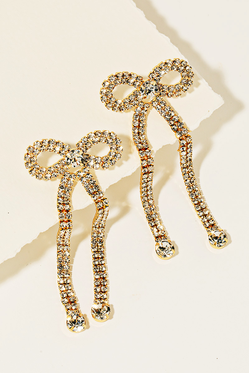 Add a touch of luxury to any outfit, this pair of earrings incorporates a remarkable rhinestone studded ribbon bow design. Infuse elegance into your daily wardrobe with the versatile charm of this must-have accessory. Available in GDCR, RHCR and S. This item is sold in packs of 1.