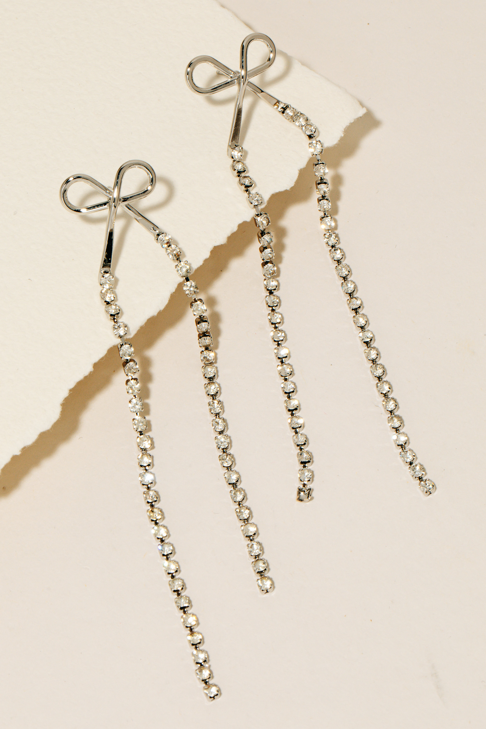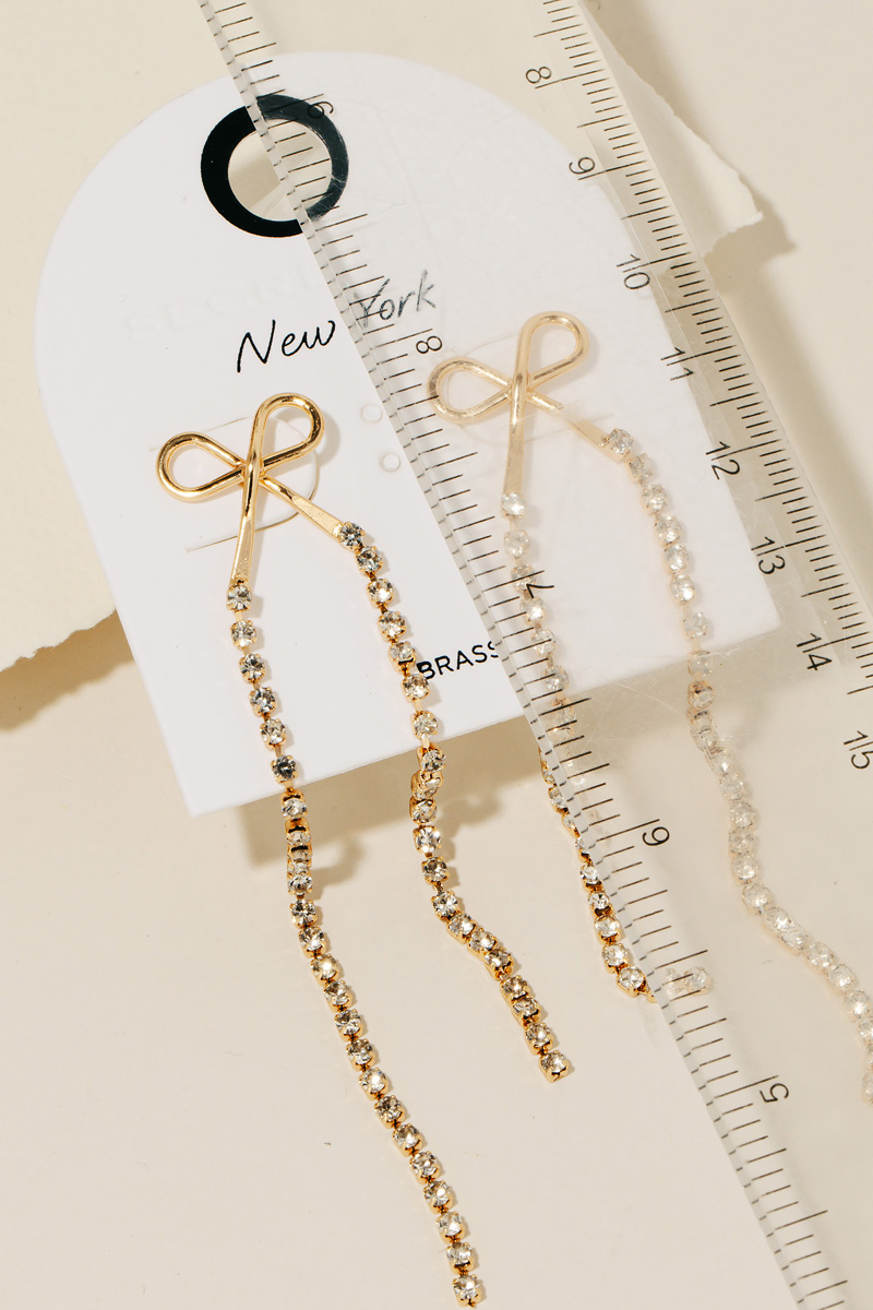 • Elevate any look, this pair of dangle earrings incorporates a flawless ribbon bow and rhinestone chain design. Transform your outfit from ordinary to extraordinary with the touch of elegance provided by this versatile accessory. Available in GD and RH. This item is sold in packs of 1.