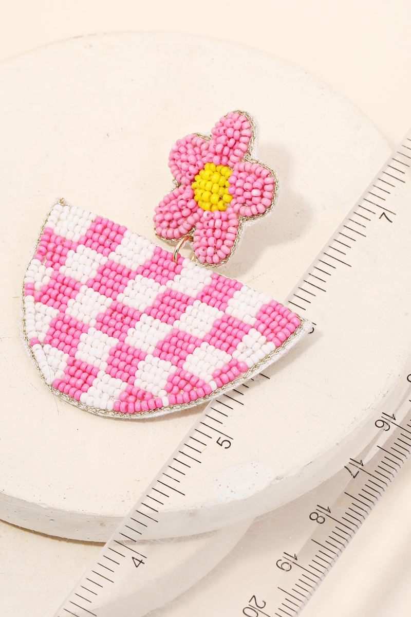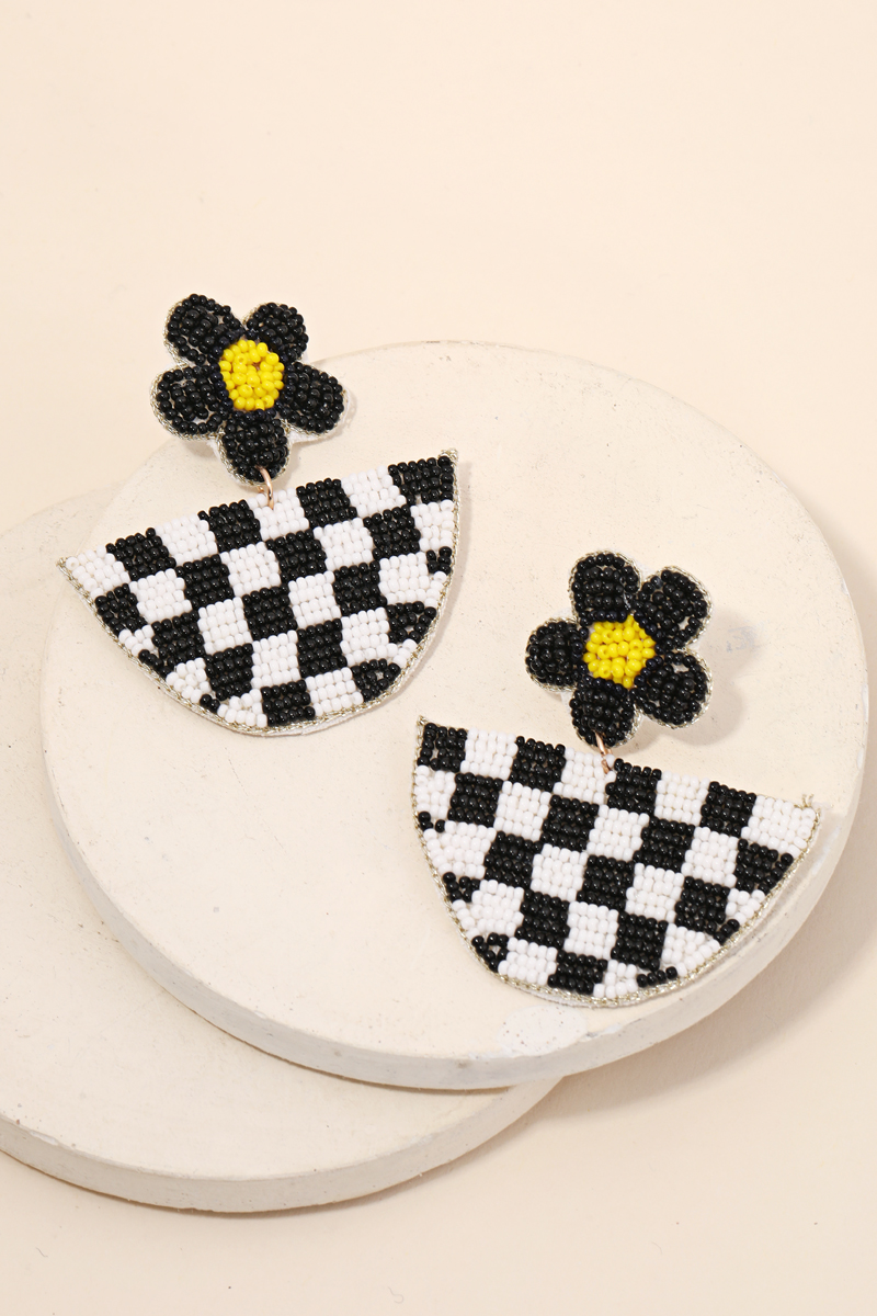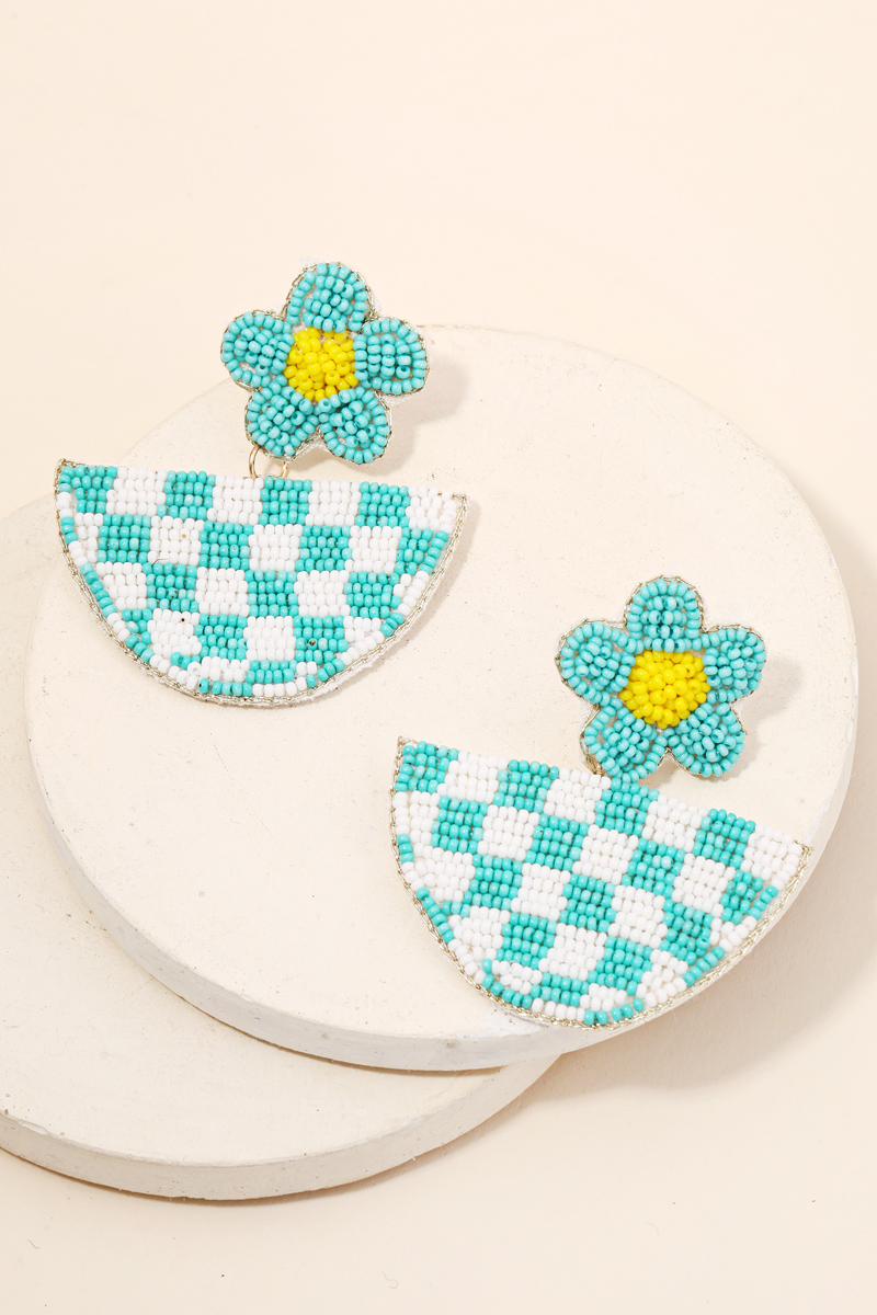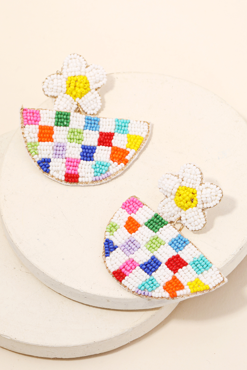 A new stunning pair of drop earrings that has a seed beaded checkered semicircle drop earrings design. A beautiful gift for a loved one! Available in BK, FU, TQ and WTMT. This item is sold in packs of 1.