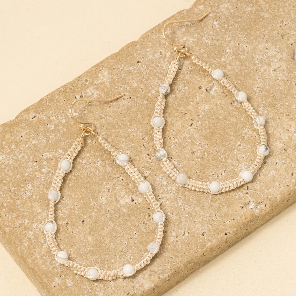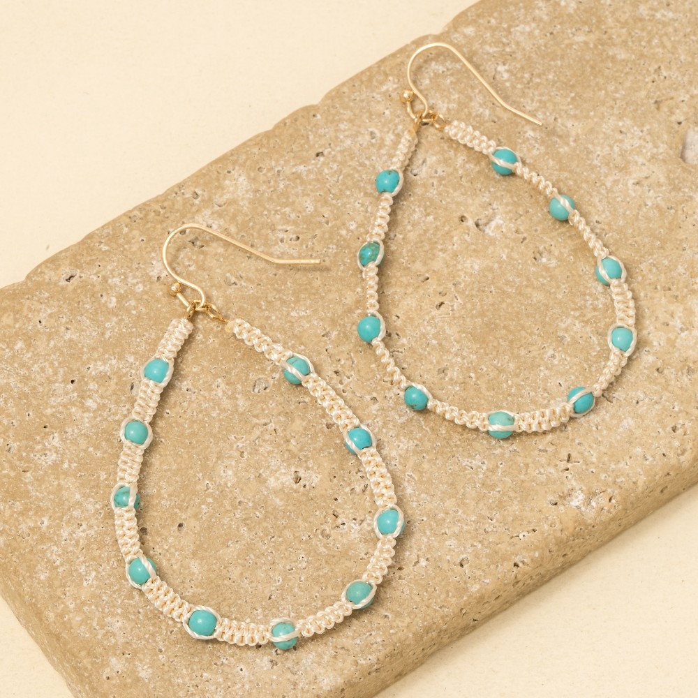 This pair of drop earrings is made with 60% Cotton 30% Semi-Precious Stone 10% Brass.