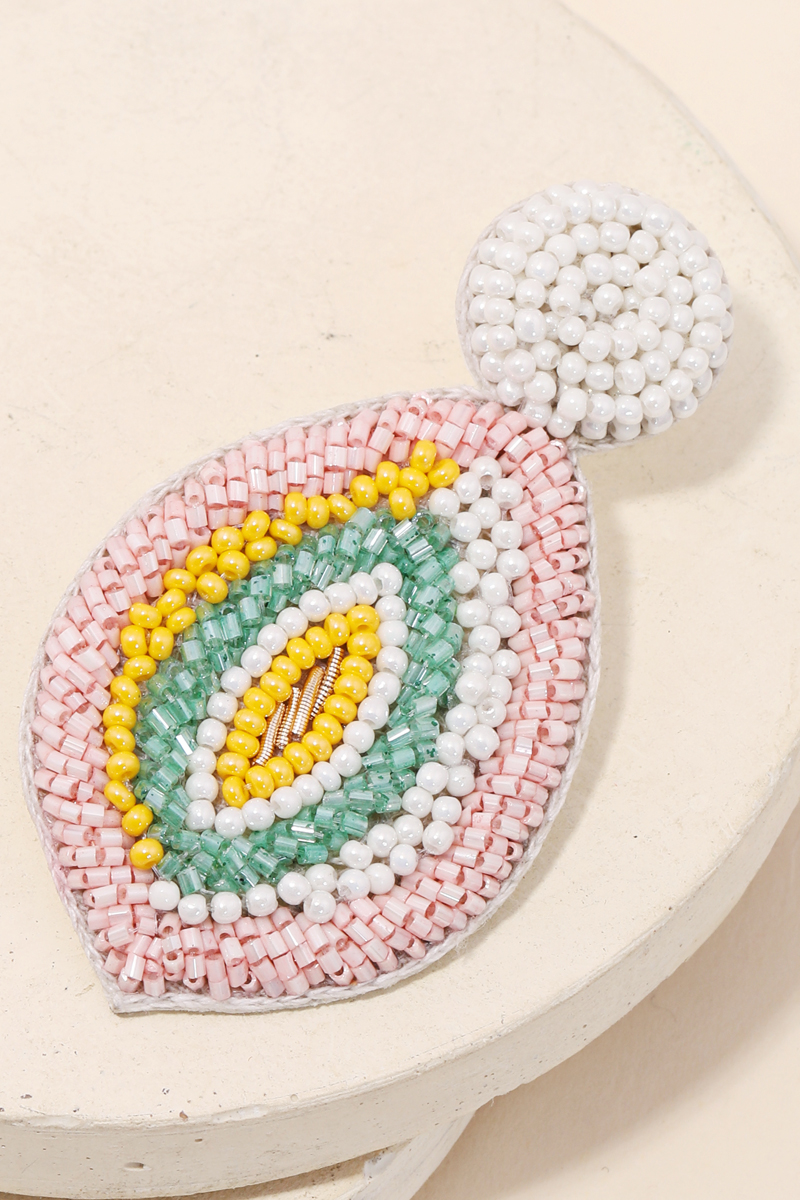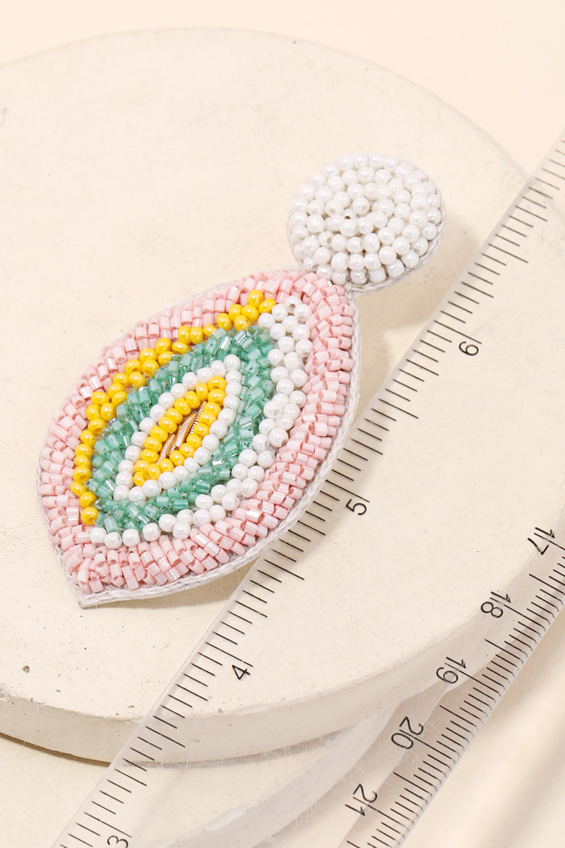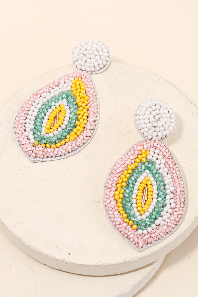This charming classy chic trending new must have pair of earrings have a striped seed beaded oval earrings design. Accents any outfit perfectly!