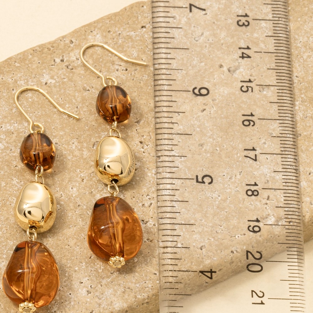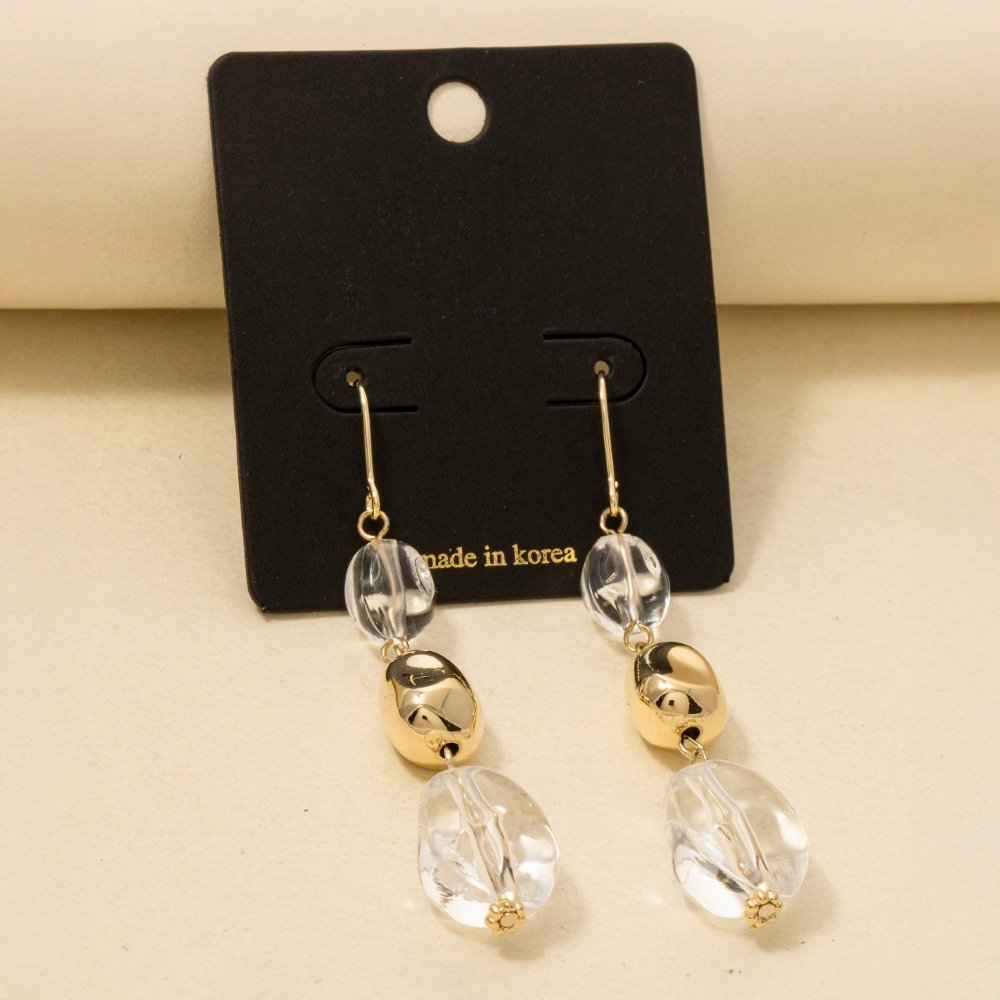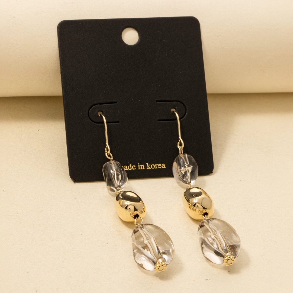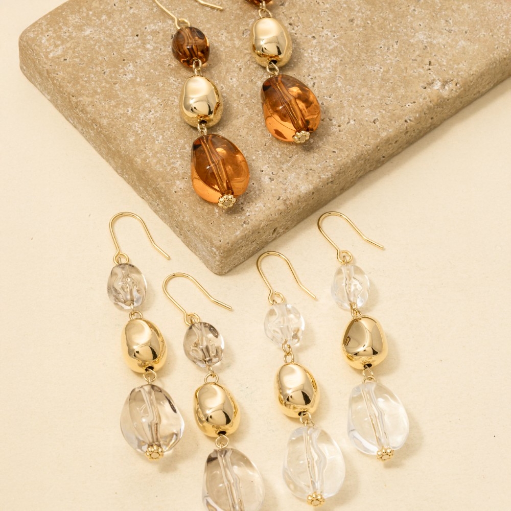 - Perfect for any fashion-forward individual, this pair of drop earrings brings a one-of-a-kind tiered clear acrylic beads design. Embrace fashion flexibility with this versatile pair of drop earrings, designed to effortlessly enhance the sophistication of any outfit. Available in BR, CL, GR. This item is sold in packs of 1.