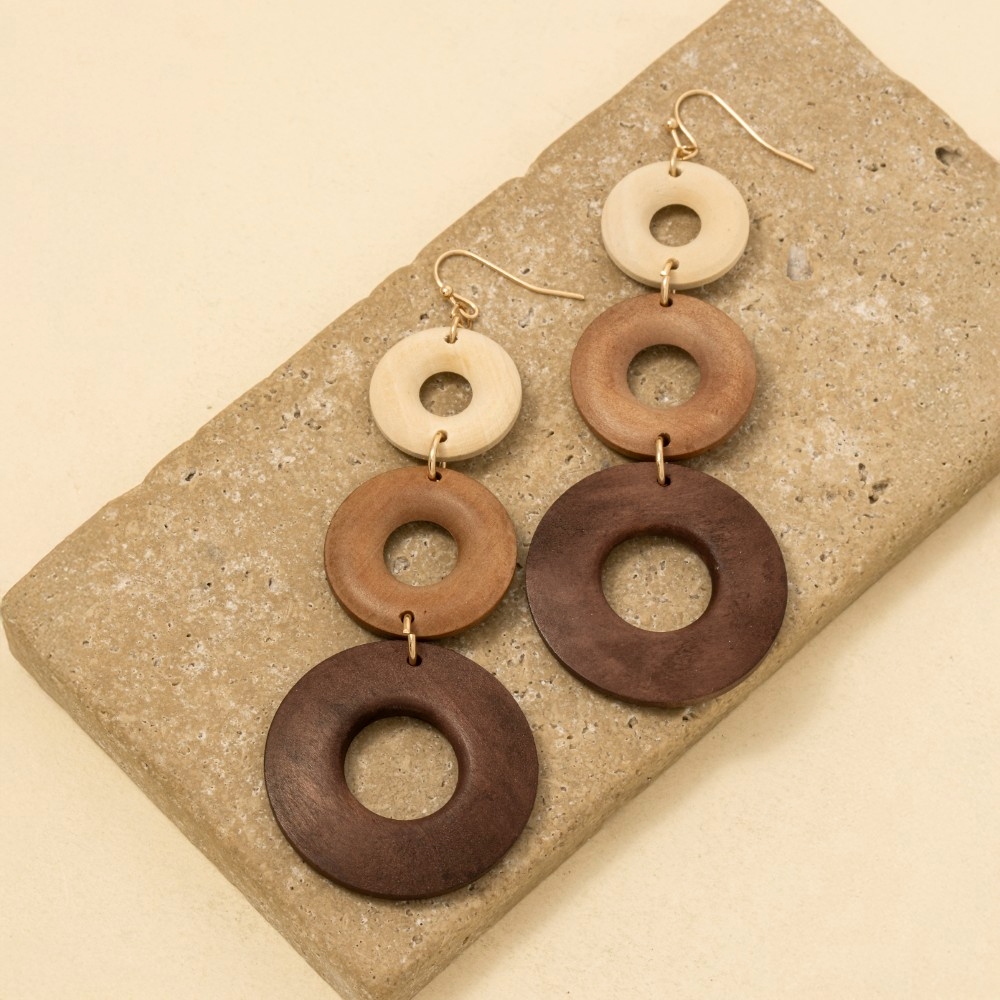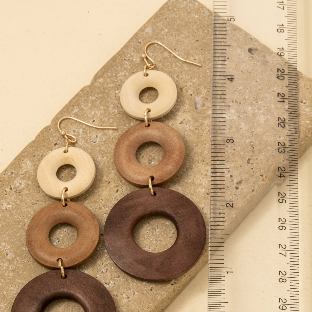 Sleek and modern, this pair of dangle earrings encompasses a grand tiered multi tone wooden hoop design. A perfect addition to your wardrobe that effortlessly enhances your style. Available in MLT. This item is sold in packs of 1.