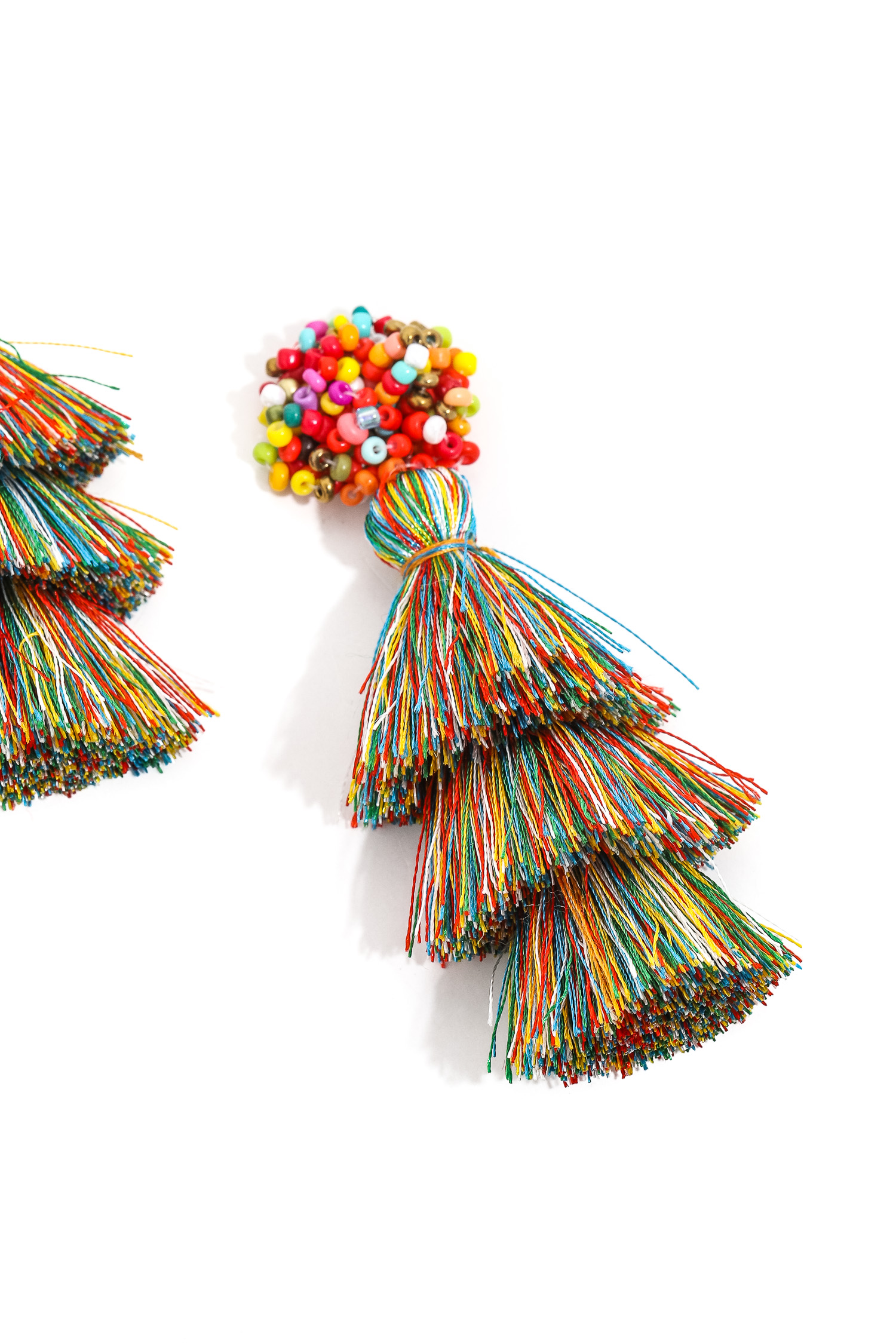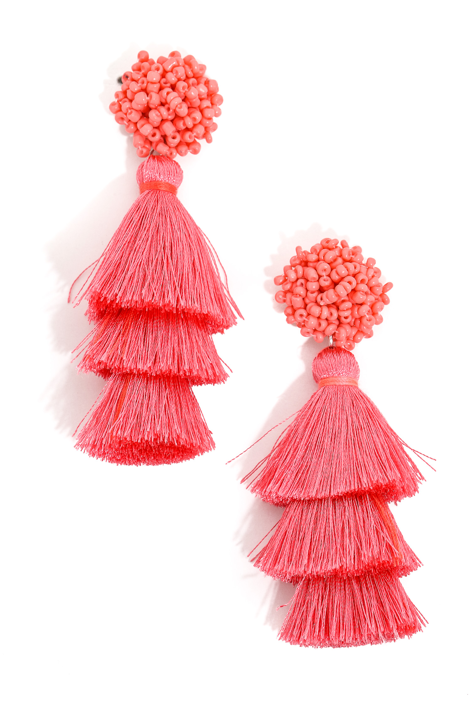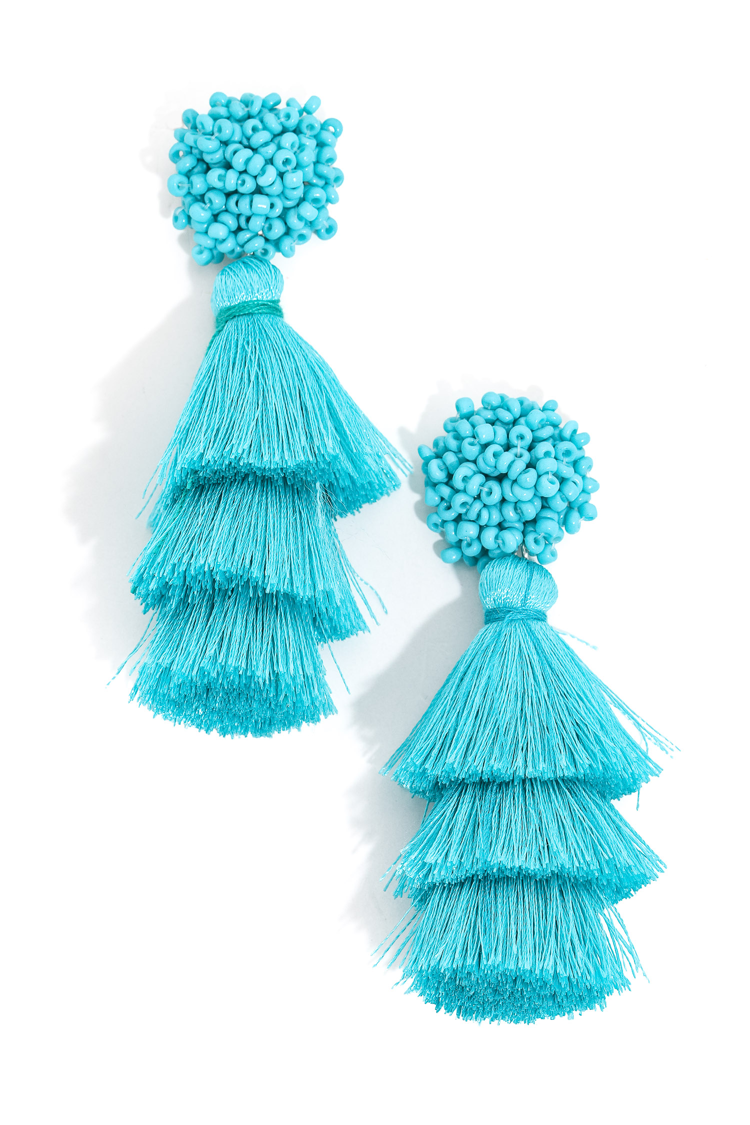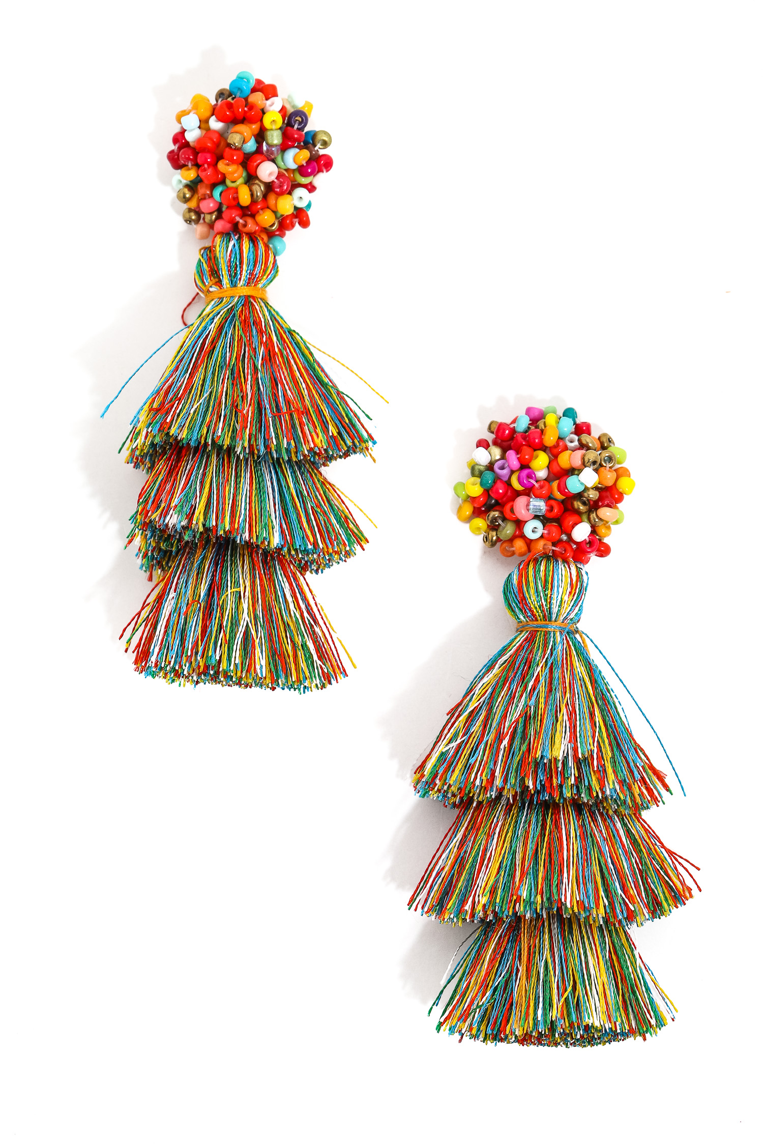 An absolute must have trending in season pair of earrings features a detailed triple tassel pompom earring design. Perfect for t