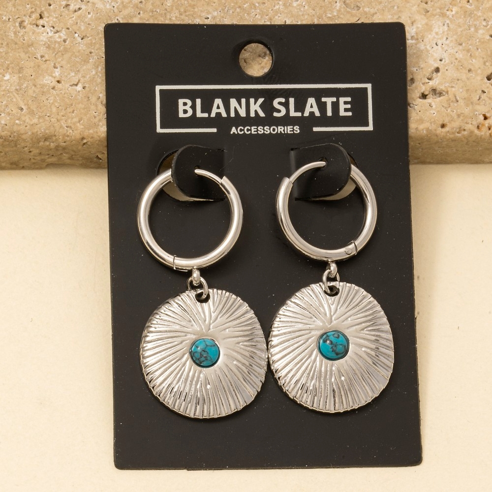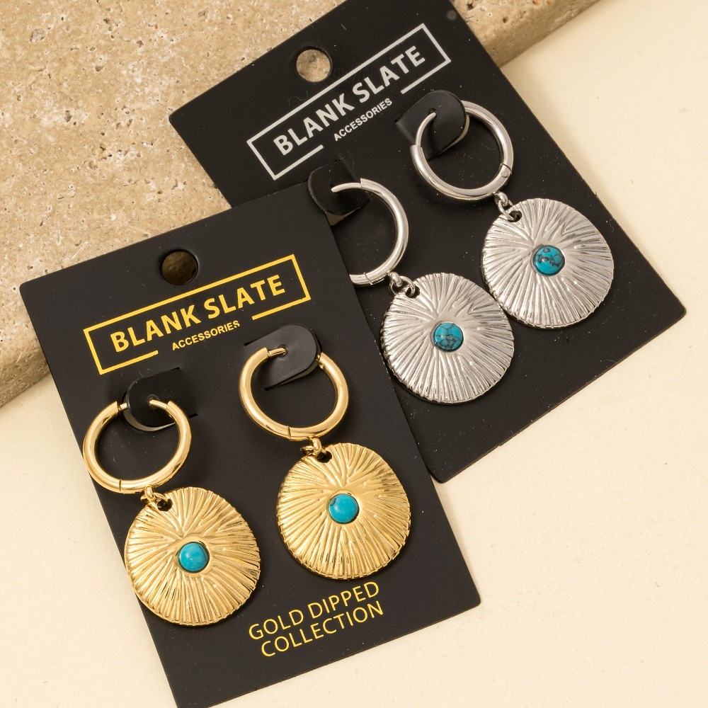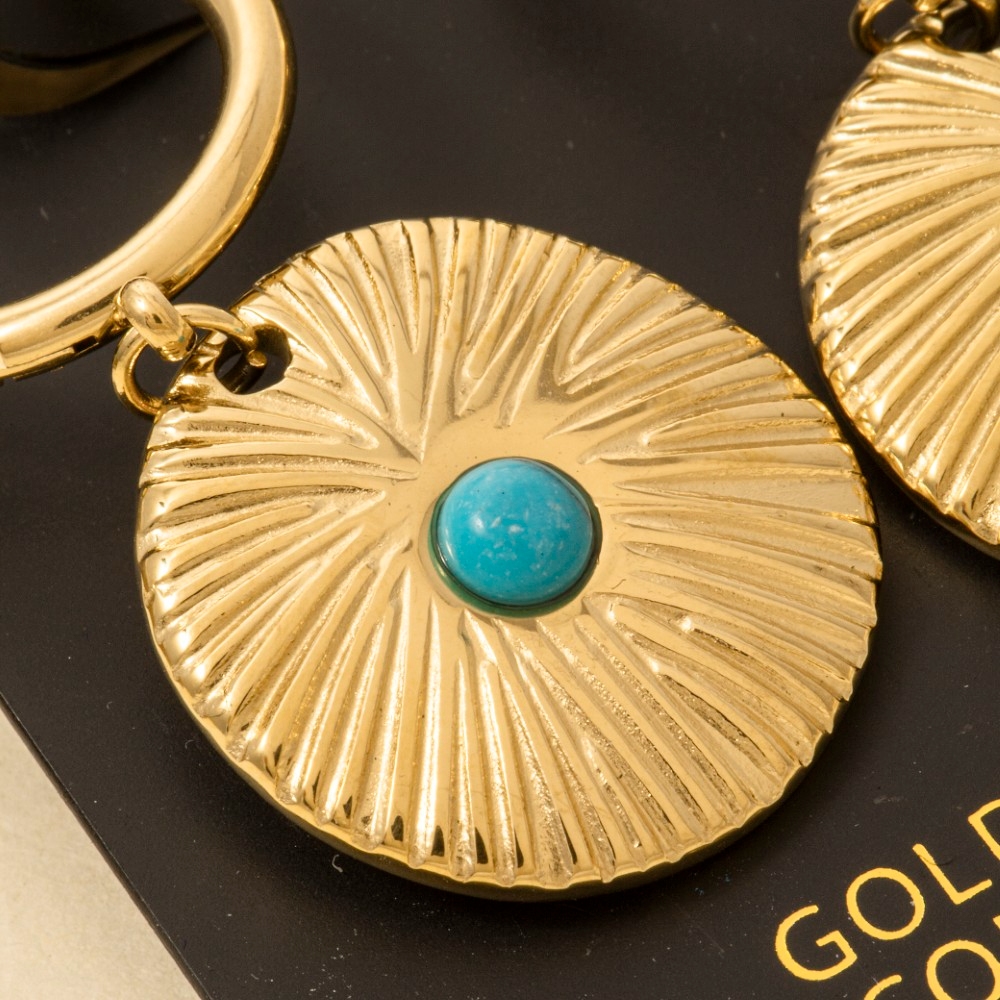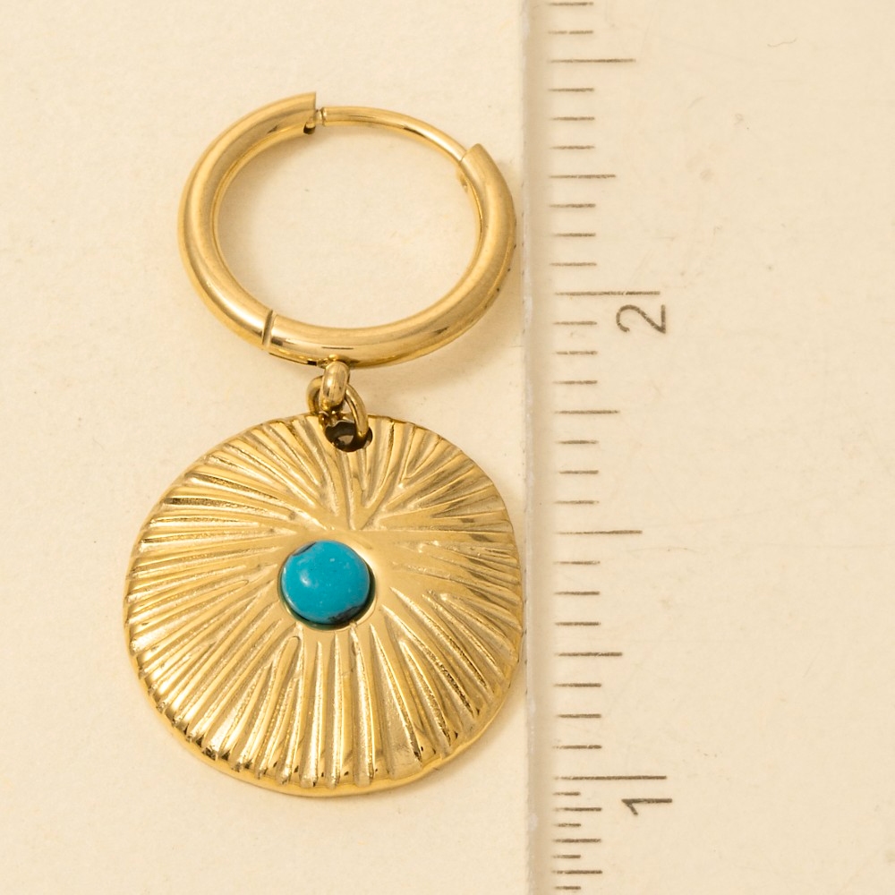 • This piece is both elegant and versatile, this pair of drop earrings evokes a captivating turquoise center textured disc design. Elevate your style effortlessly with this versatile pair of drop earrings, enhancing the appeal of any ensemble. Available in G, S. This item is sold in packs of 1.
