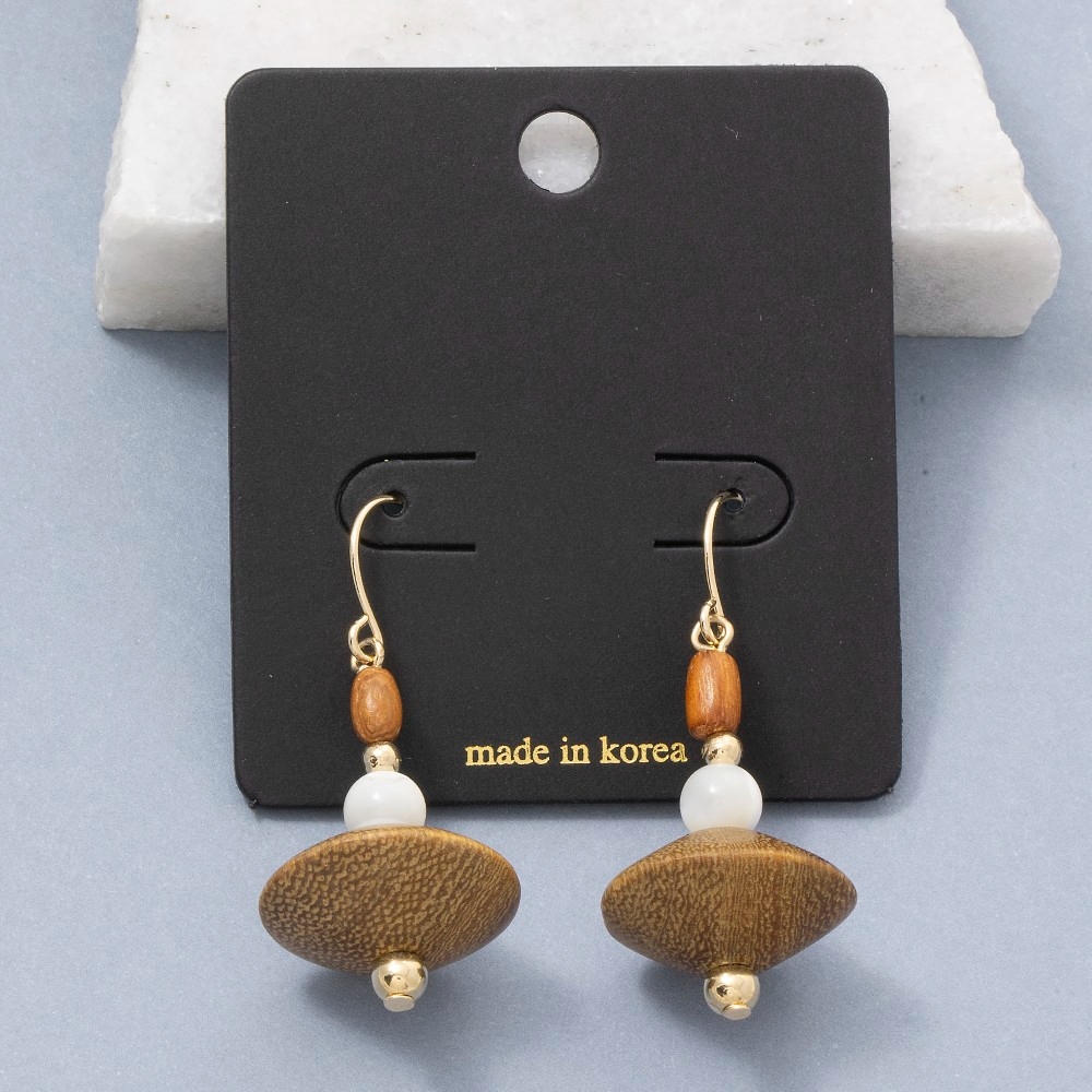 Add some edge to your wardrobe, this pair of drop earrings incorporates a remarkable wood bead natural disc design. A stylish pair of drop earrings that's perfect for complementing your favorite outfit. Available in GOLD. This item is sold in packs of 12.