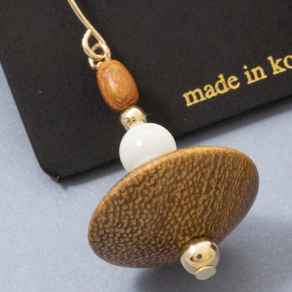 This pair of drop earrings is made with 10% Brass, 10% Shell and 80% Wood.