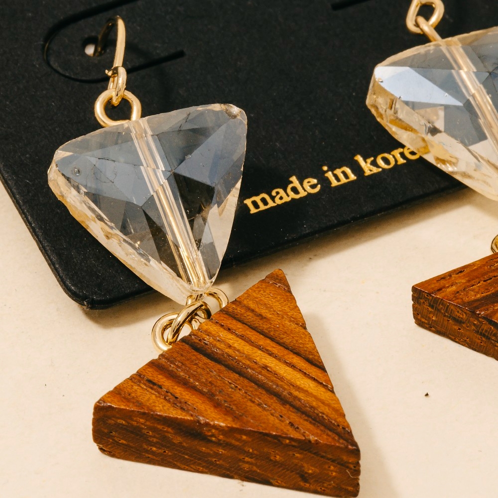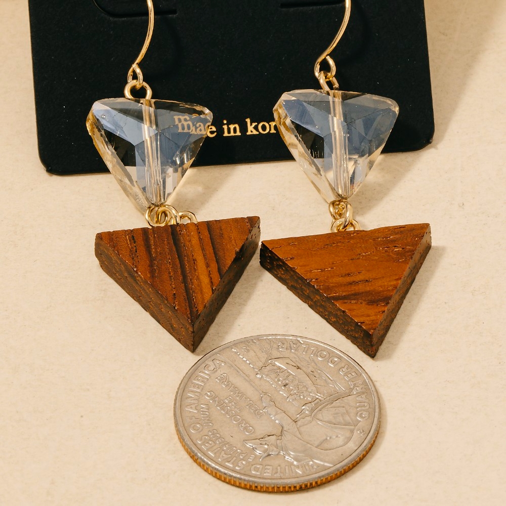 Sleek and modern, this pair of dangle earrings highlights a special wood and glass triangle design. Perfect for dressing up your favorite outfit, this pair of dangle earrings is a must-have. Available in GOLD. This item is sold in packs of 1.