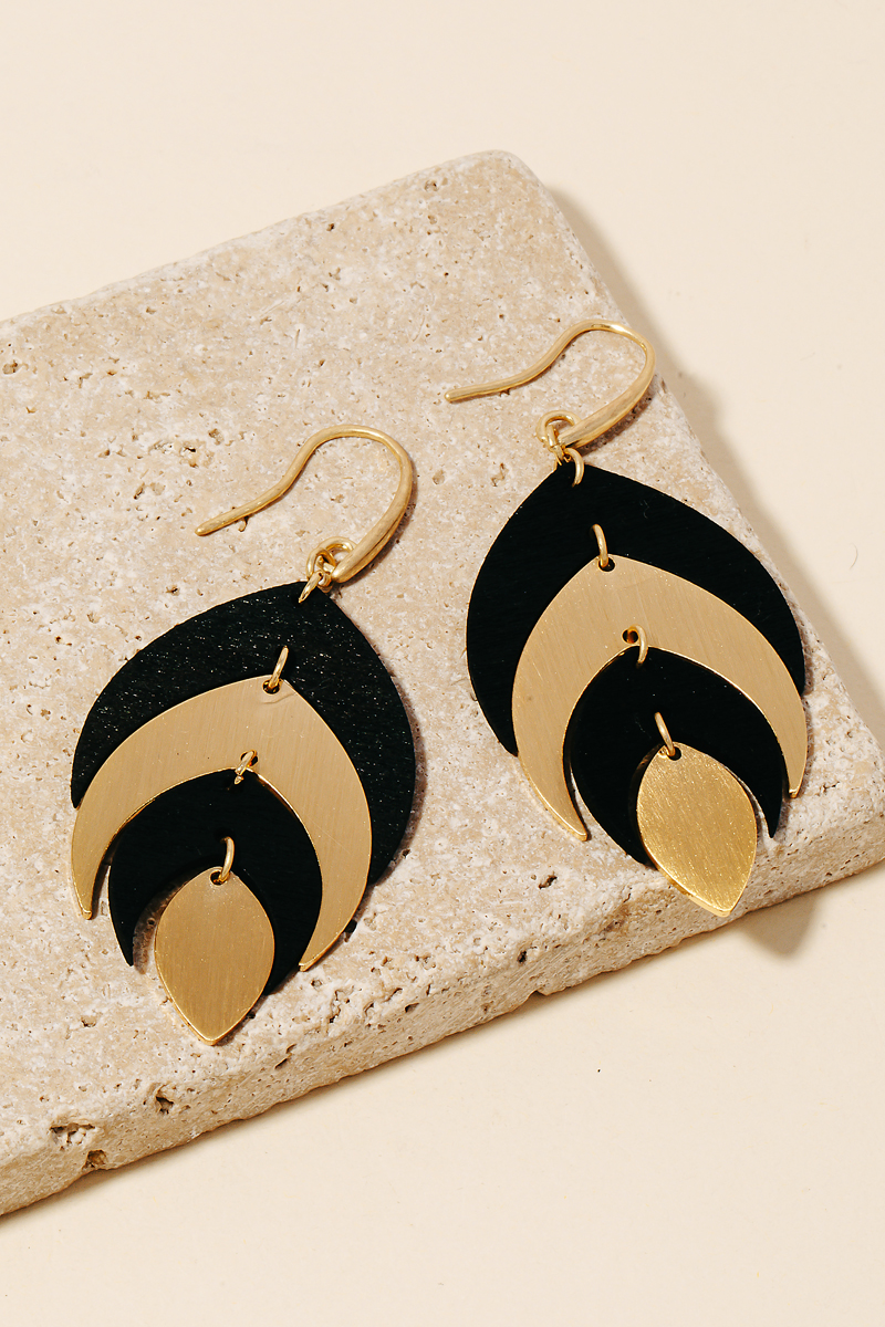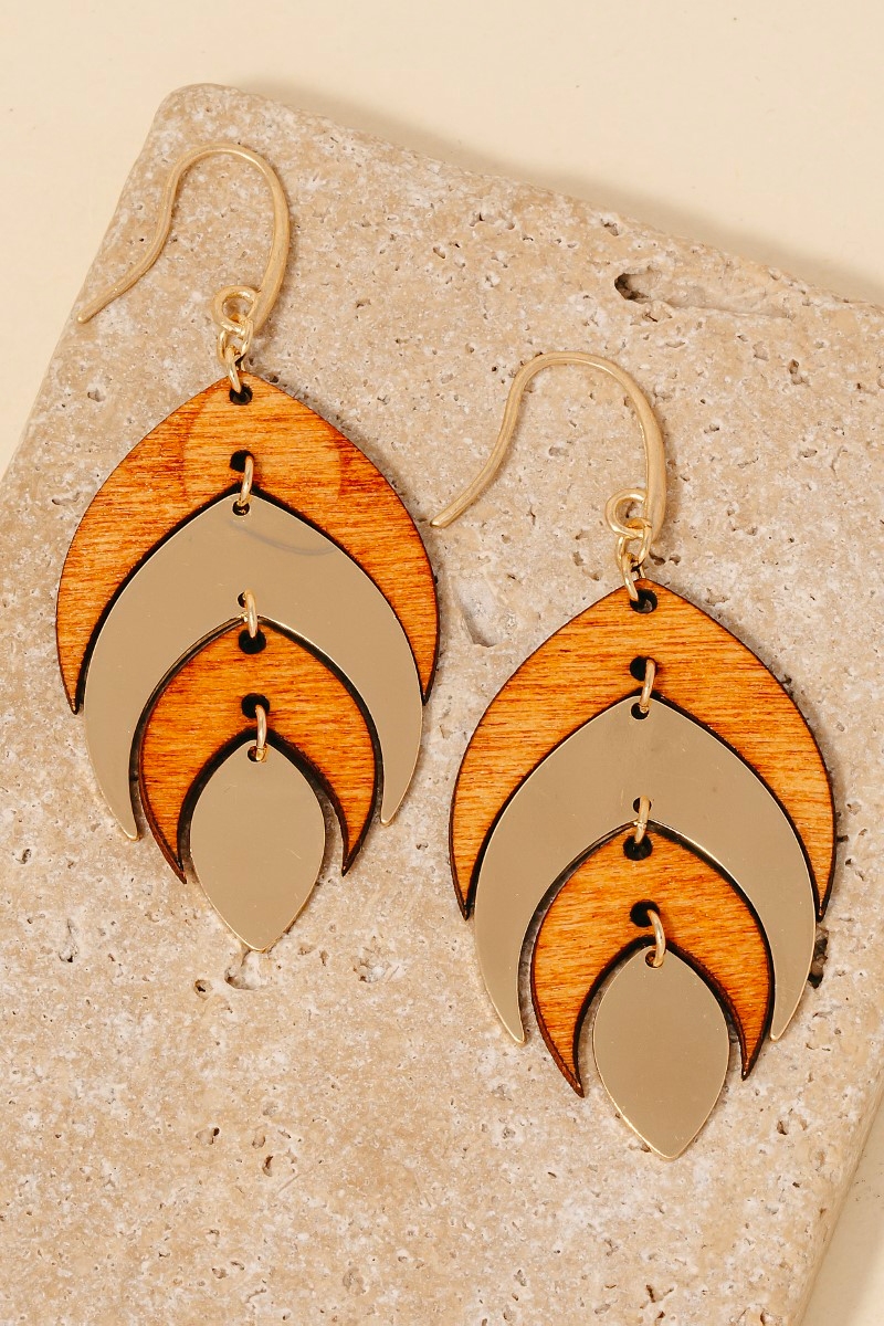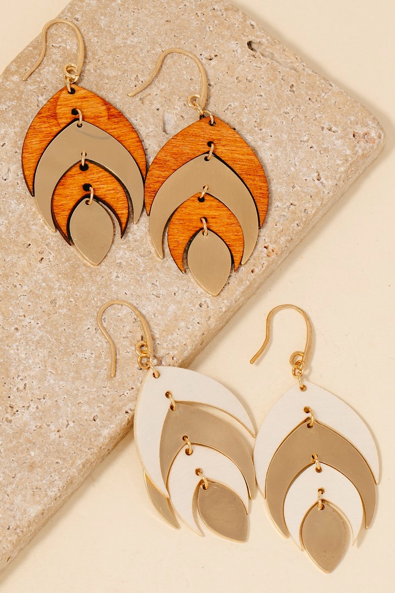 • The epitome of sophistication and style, this pair of earrings includes a stunning wood and metallic leaf dangle hook design. This pair of earrings is the perfect finishing touch to any outfit, adding a touch of sophistication and glamour. Available in BRN, IV and JET. This item is sold in packs of 1.