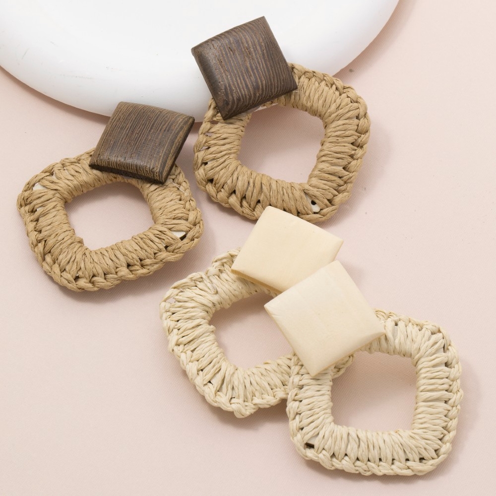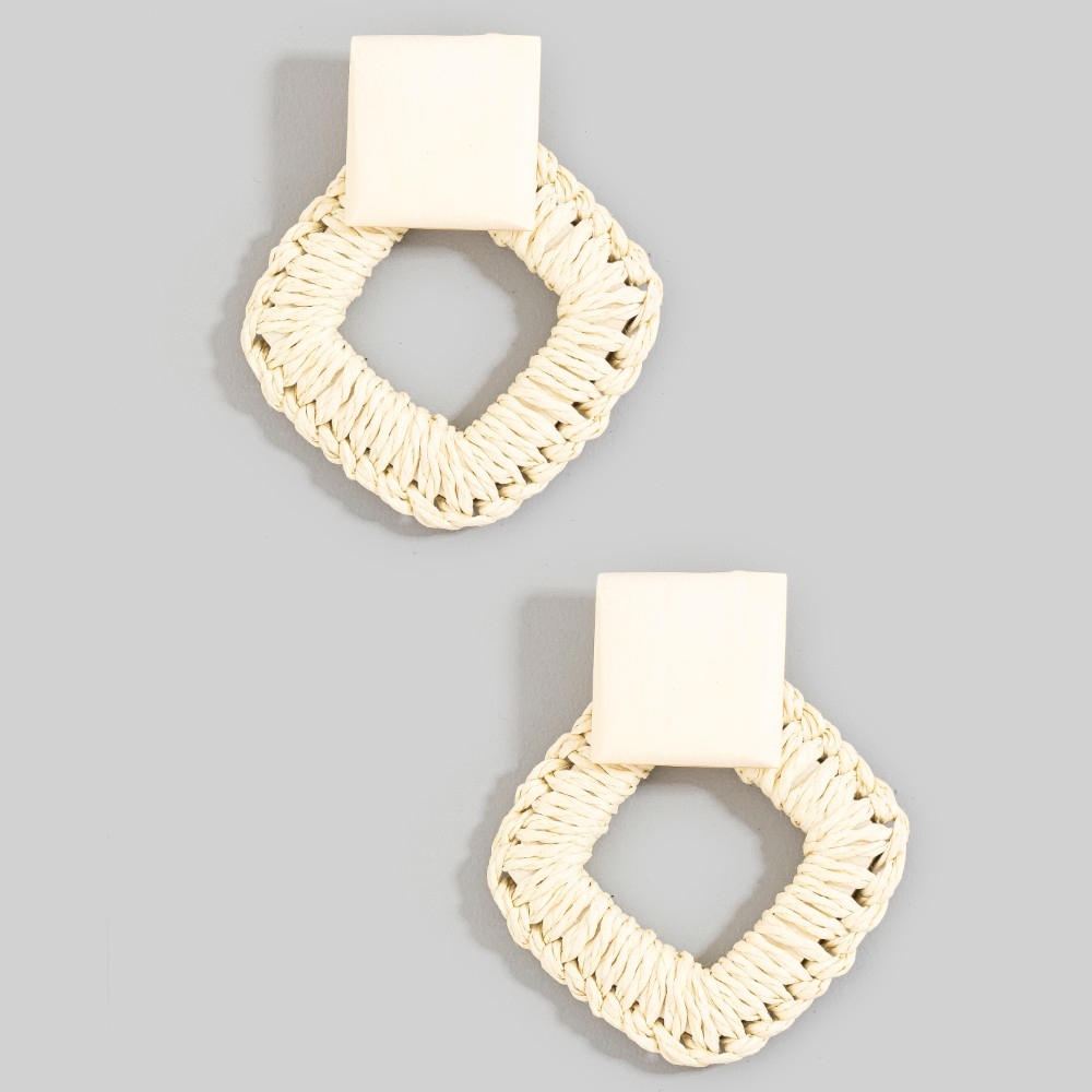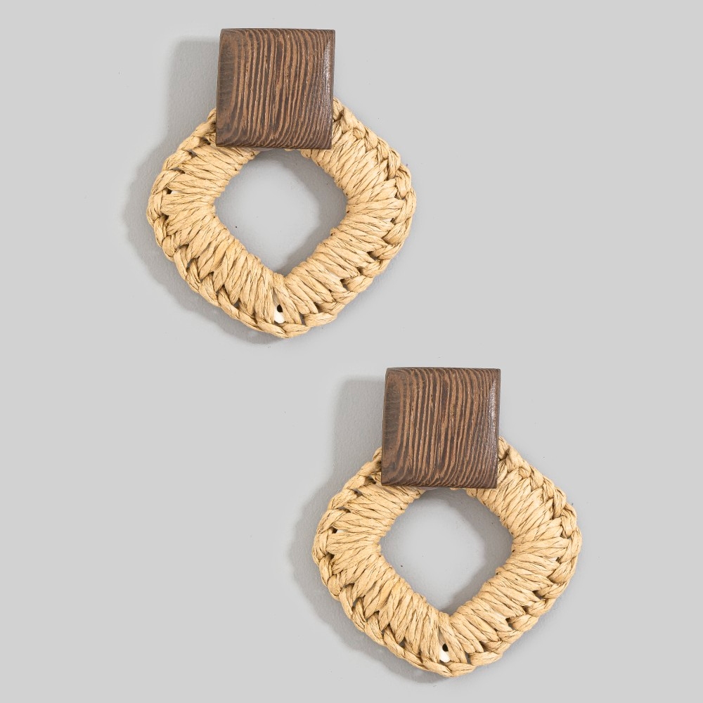 - This piece is perfect for those who want to showcase their unique style, this pair of dangle earrings features an exceptional wood and raffia square stud design. Perfect for adding a touch of glamour and sophistication to any outfit, this pair of dangle earrings is a must-have. Available in CRM, NAT. This item is sold in packs of 1.