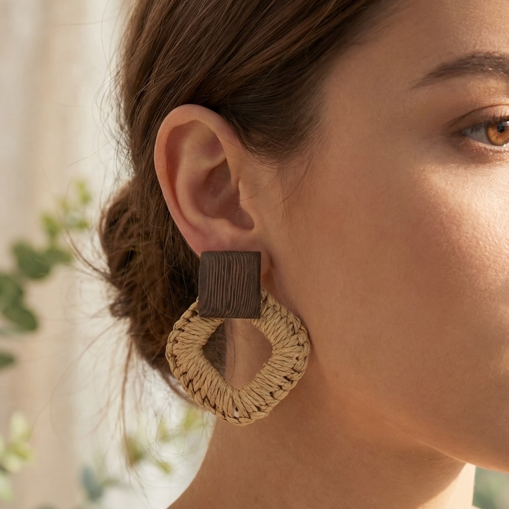 - This pair of dangle earrings is made with 50% Wood 50% Raffia.