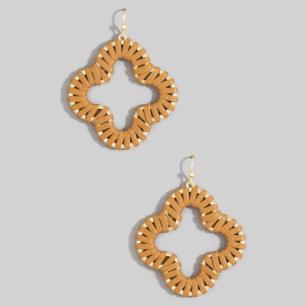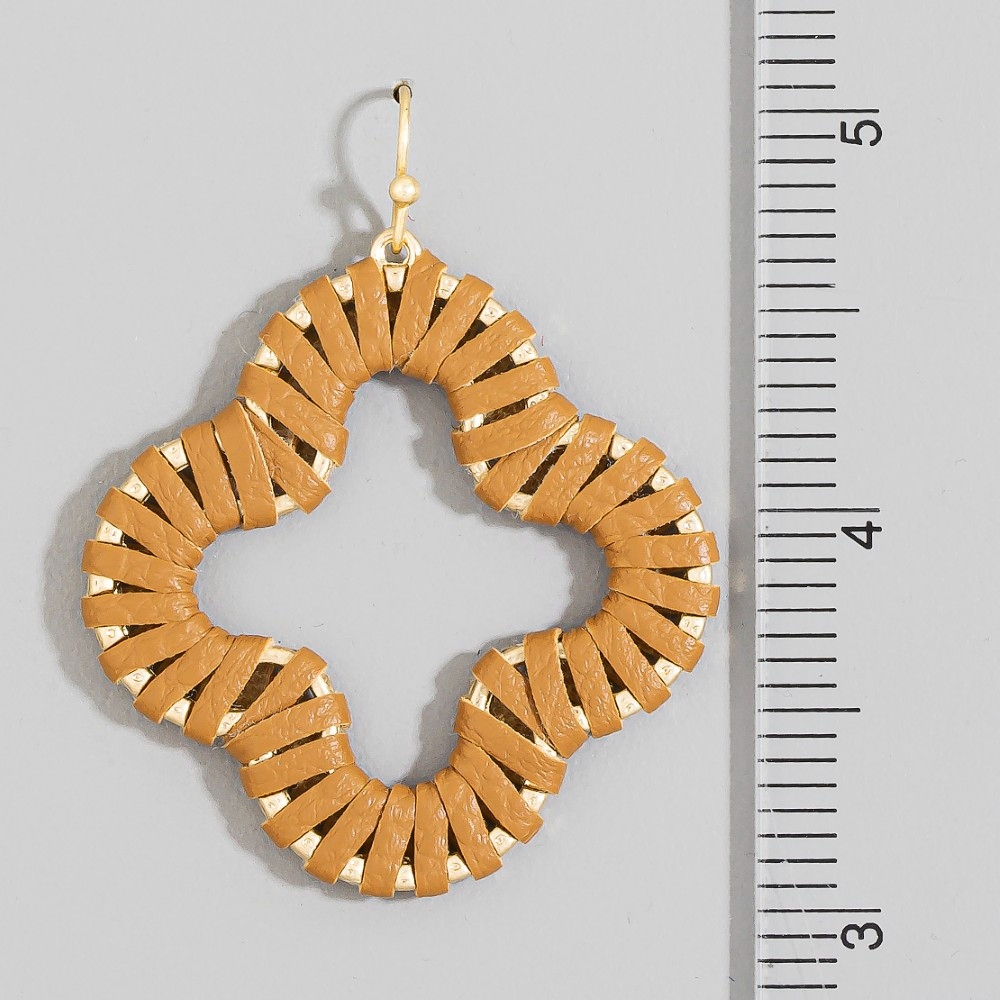 - The perfect way to add some edge to your look, this pair of dangle earrings features a distinct faux leather wrap clover design. Experience the transformative power of this versatile pair of dangle earrings, effortlessly enhancing the overall aesthetic of your outfit. Available in BRN, IV and JET. This item is sold in packs of 1.