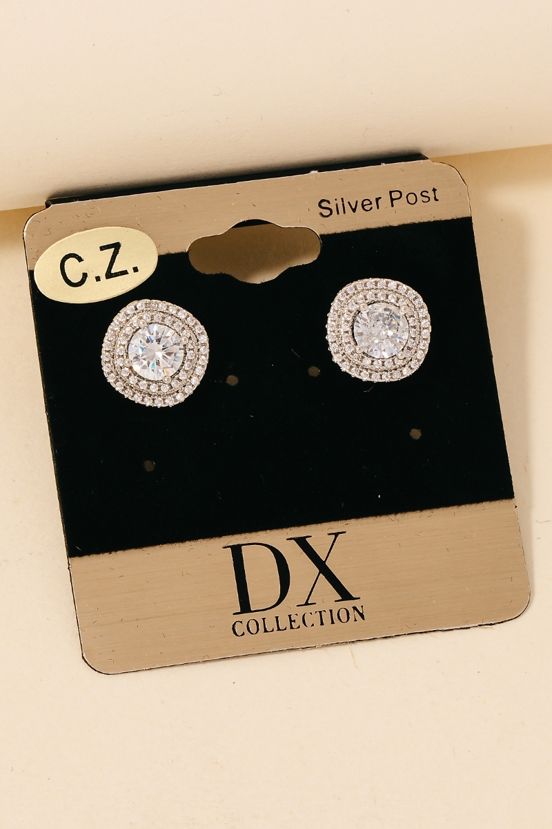 • This pair of stud earrings features a fashionable gold dipped cubic zirconia double halo set style. Unveil a new dimension of sophistication as this pair of stud earrings effortlessly enhances the elegance of your ensemble.