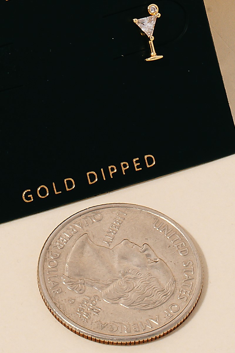 • This pair of stud earrings showcases a unique gold dipped cubic zirconia martini glass style. Experience the joy of accessorizing with this piece that effortlessly combines versatility and charm.