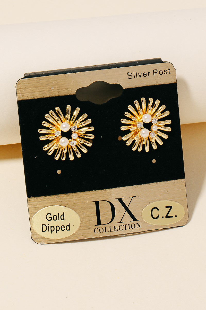 Gold Dipped Cz And Pearl Sunburst Stud Earrings