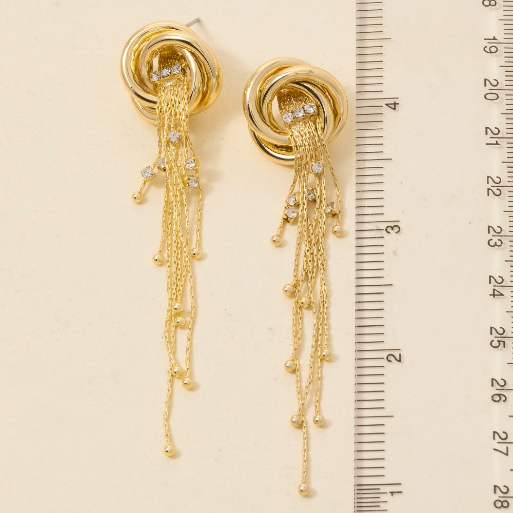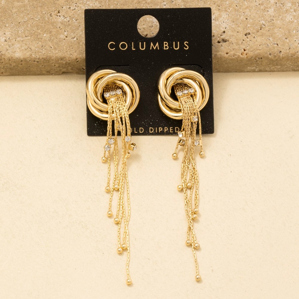 Perfect for any fashion-forward individual, this pair of stud earrings radiates a sleek gold dipped knot and long chain fringe design. Unleash the potential of your wardrobe with this versatile pair of stud earrings, ensuring a touch of elegance in every ensemble. This item is sold in packs of 1.