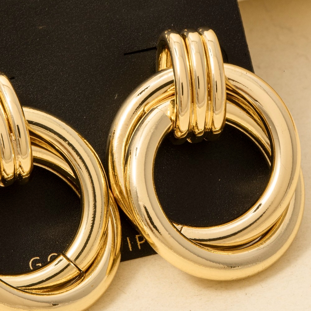 • Stay ahead of the fashion curve, this pair of drop earrings incorporates a flawless gold dipped layered door knocker design. This item is a great way to add some texture and dimension to any outfit. Available in GOLD. This item is sold in packs of 1.