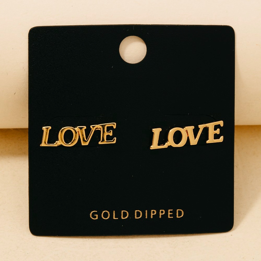 • A bold and daring choice that is sure to impress, this pair of stud earrings embodies a sophisticated gold dipped love design. This pair of stud earrings is ideal for both casual and formal events, adding a touch of sophistication to any outfit. Available in GOLD. This item is sold in packs of 1. Columbus Jewelry