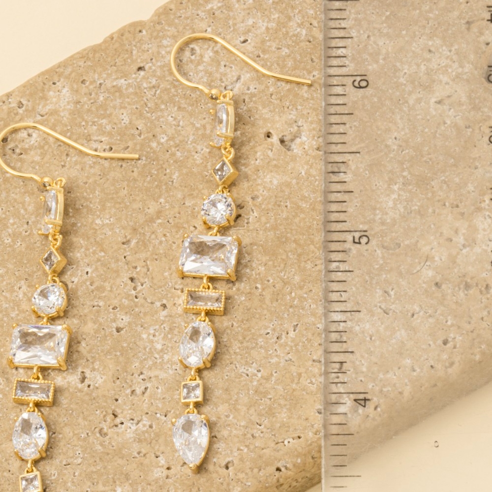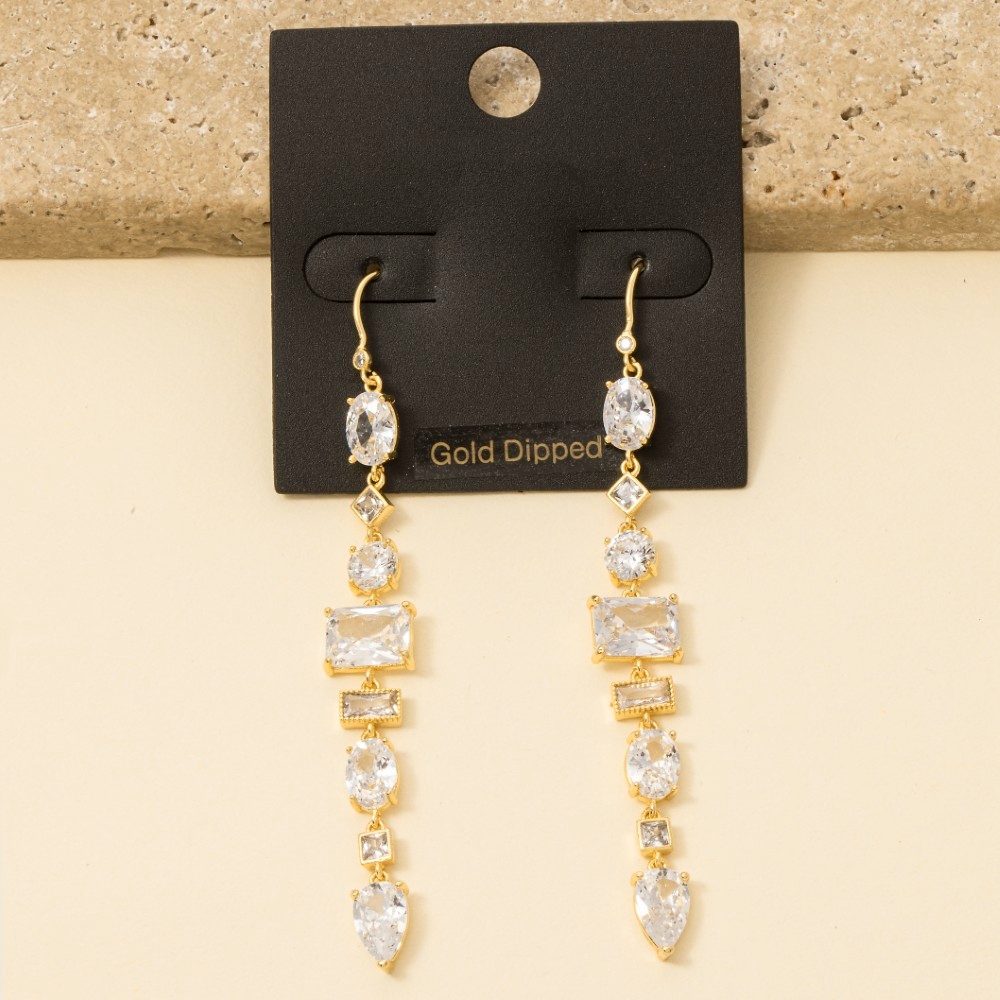 • Add a touch of luxury to any outfit, this pair of earrings presents a striking gold dipped mixed cubic zirconia shapes dangle chain design. Perfect for adding a pop of color or texture to any outfit, this pair of earrings is a must-have. Available in GOLD. Columbus Jewelry. This item is sold in packs of 1.
