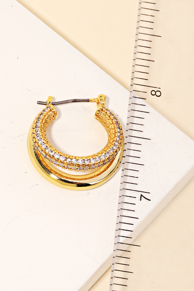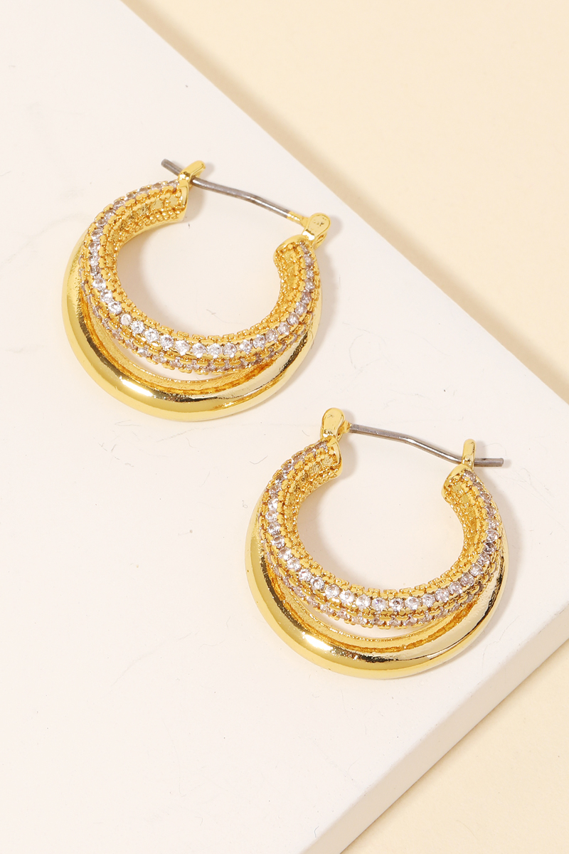 • This piece is designed to be both stylish and functional, this pair of gold dipped earrings displays a unique gold dipped pave mini layered hoop earrings design. This versatile accessory adds a touch of elegance to any outfit. Available in G. This item is sold in packs of 1.
