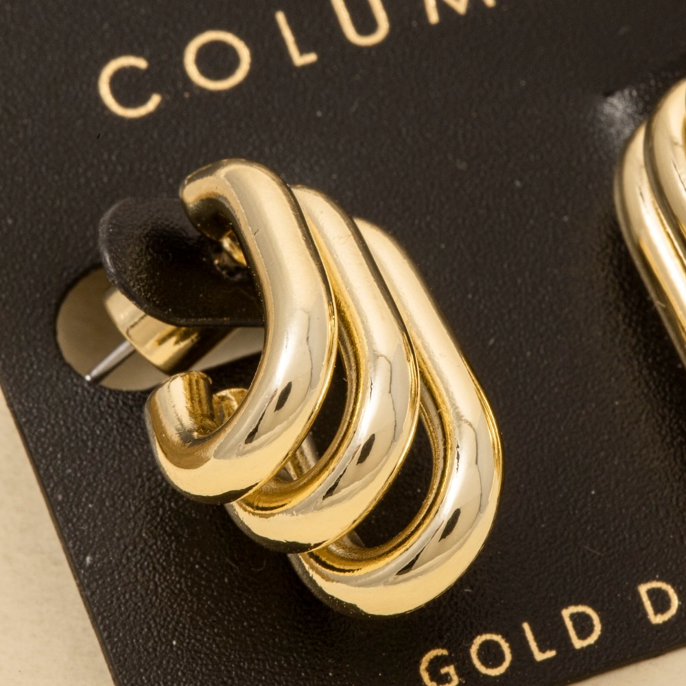 • Stay ahead of the fashion curve, this pair of hoop earrings includes a stunning gold dipped triple layered oval design. Unleash the potential of your wardrobe with this versatile pair of hoop earrings, ensuring a touch of elegance in every ensemble. Available in 2. This item is sold in packs of 1.