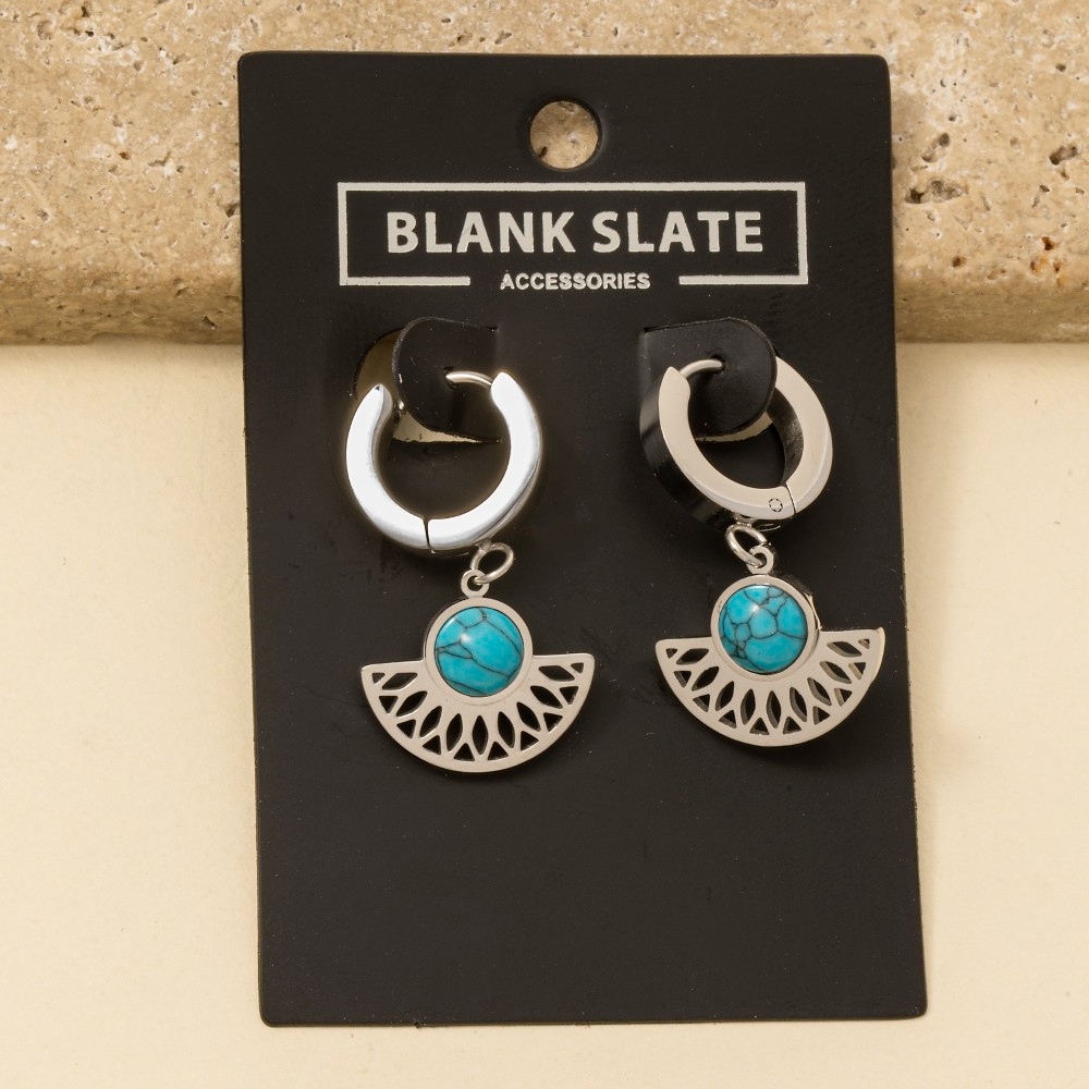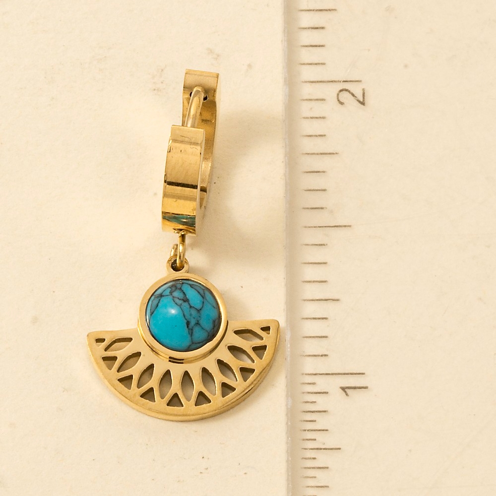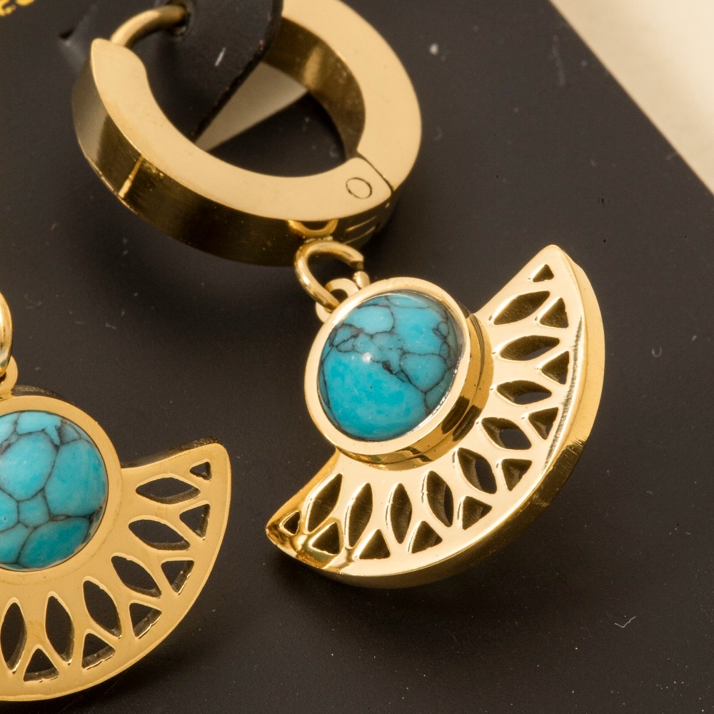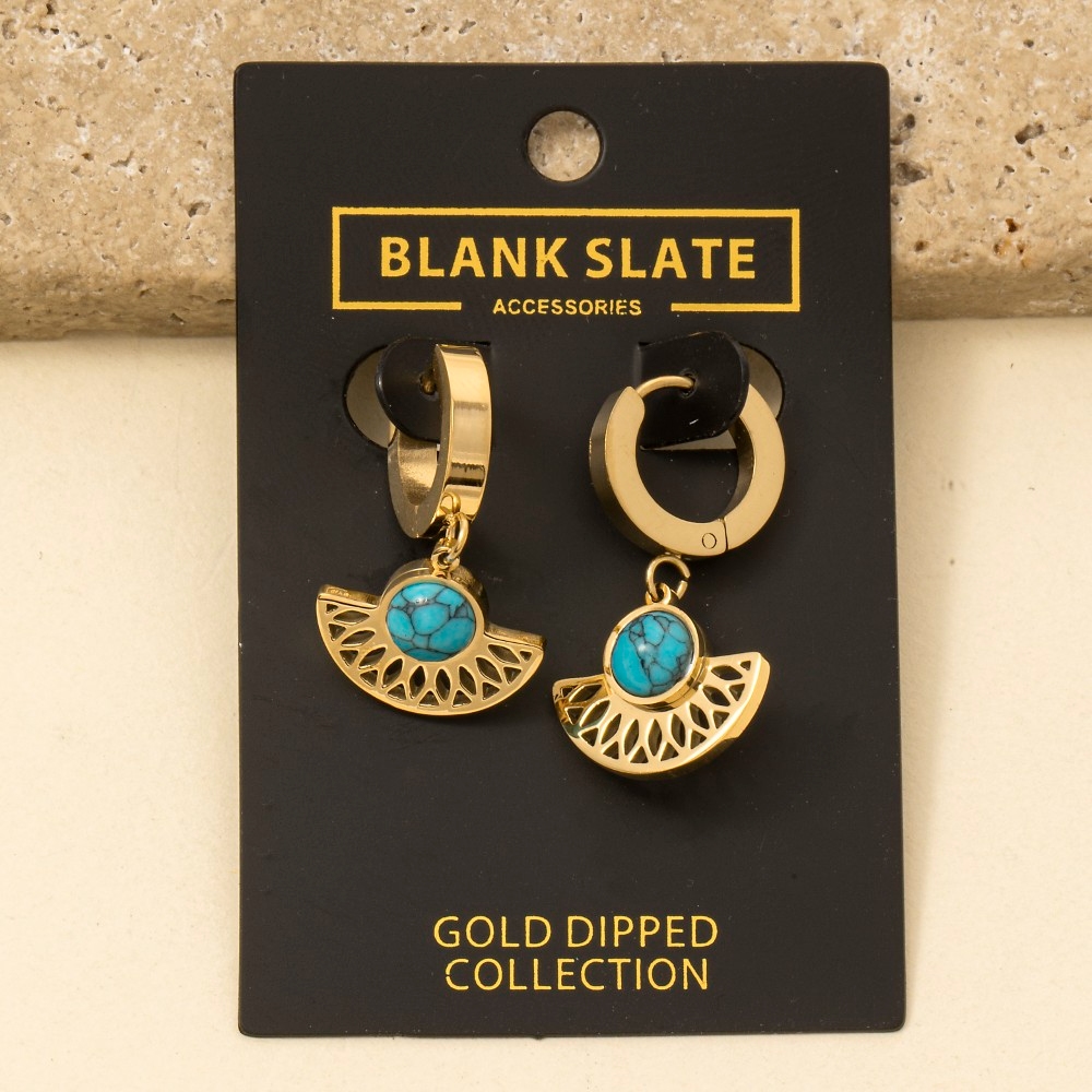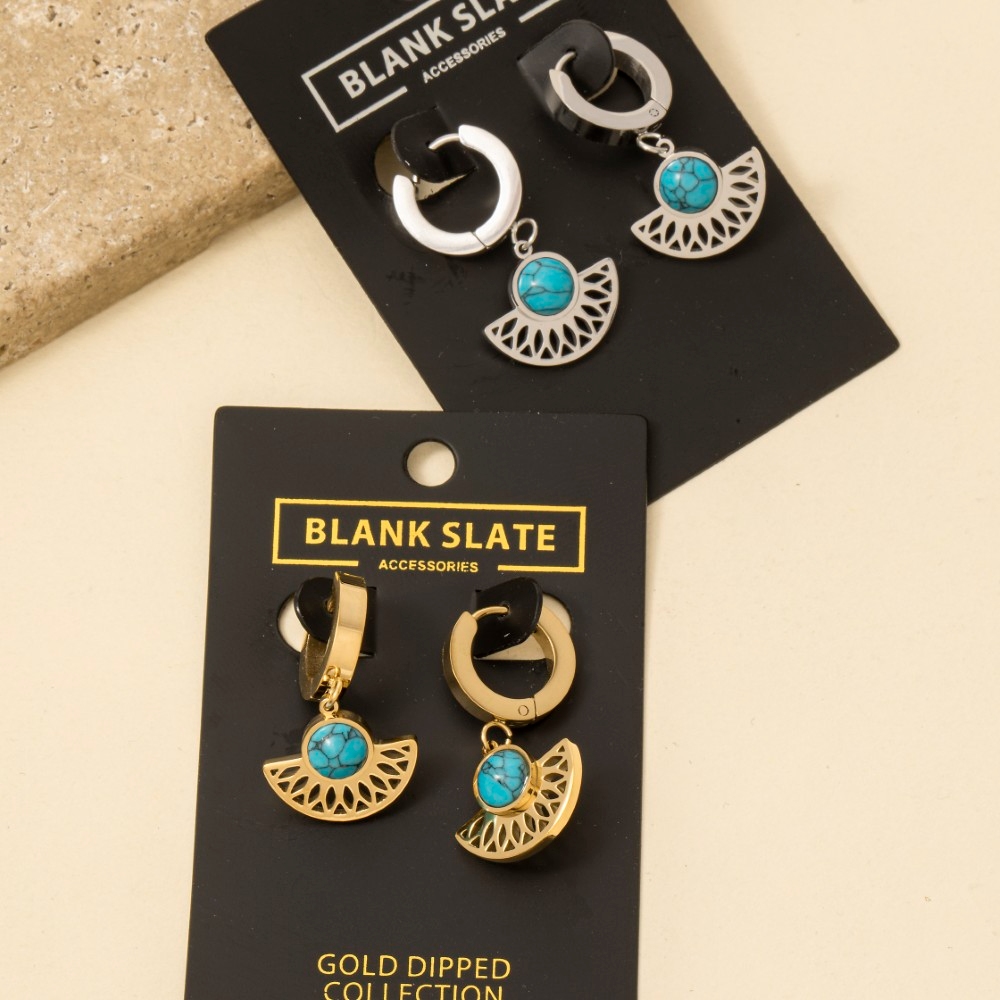 • The perfect way to elevate any outfit, this pair of drop earrings incorporates a remarkable gold dipped turquoise stone semi circle design. Make a lasting impression with this versatile pair of drop earrings, a subtle yet impactful addition to your fashion repertoire. Available in G, S. This item is sold in packs of 1.